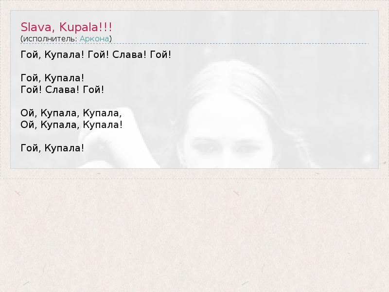 Аркона - Гой, Купала http://megalyrics.ru/lyric/%D0%B0%D1%80%D0%BA%D0%BE%D0%BD%D0%B0/%D0%B3%D0%BE%D0%B9-%D0%BA%D1%83%D0%BF%D0%B0%D0%BB%D0%B0.htm#ixzz22xhqk1ZX