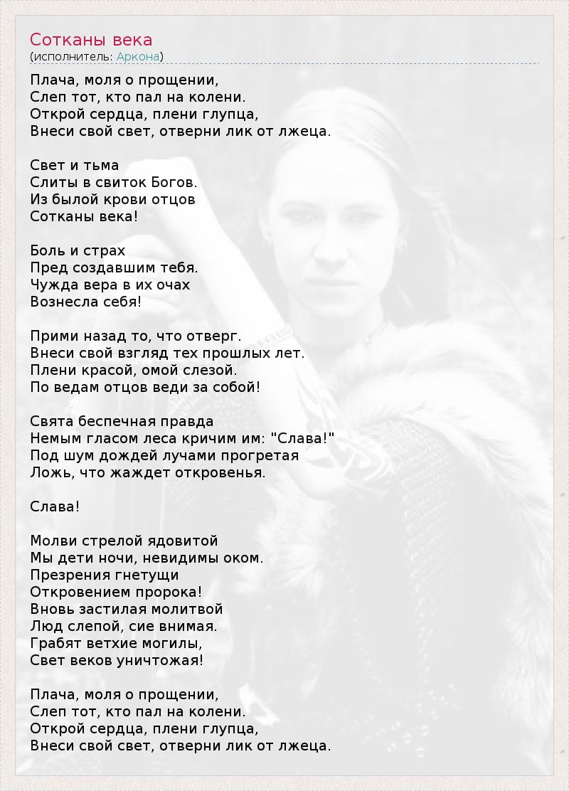Аркона - Сотканы века http://megalyrics.ru/lyric/%D0%B0%D1%80%D0%BA%D0%BE%D0%BD%D0%B0/%D1%81%D0%BE%D1%82%D0%BA%D0%B0%D0%BD%D1%8B-%D0%B2%D0%B5%D0%BA%D0%B0.htm#ixzz22xTjW2H4