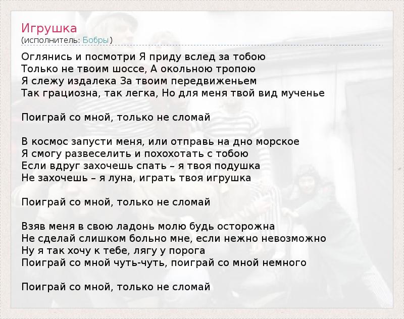 Оглянись и посмотри Я приду вслед за тобою Только не твоим шоссе, А окольною тропою Я слежу издалека За твоим передвиженьем Так грациозна, так легка, Но для меня твой вид мученье Поиграй со мной, только не сломай В космос запусти меня, или отправь на дно морское Я смогу развеселить и похохотать с тобою Если вдруг захочешь спать – я твоя подушка Не захочешь – я луна, играть твоя игрушка Поиграй со мной, только не сломай Взяв меня в свою ладонь молю будь осторожна Не сделай слишком больно мне, если нежно невозможно Ну я так хочу к тебе, лягу у порога Поиграй со мной чуть-чуть, поиграй со мной немного Поиграй со мной, только не сломай