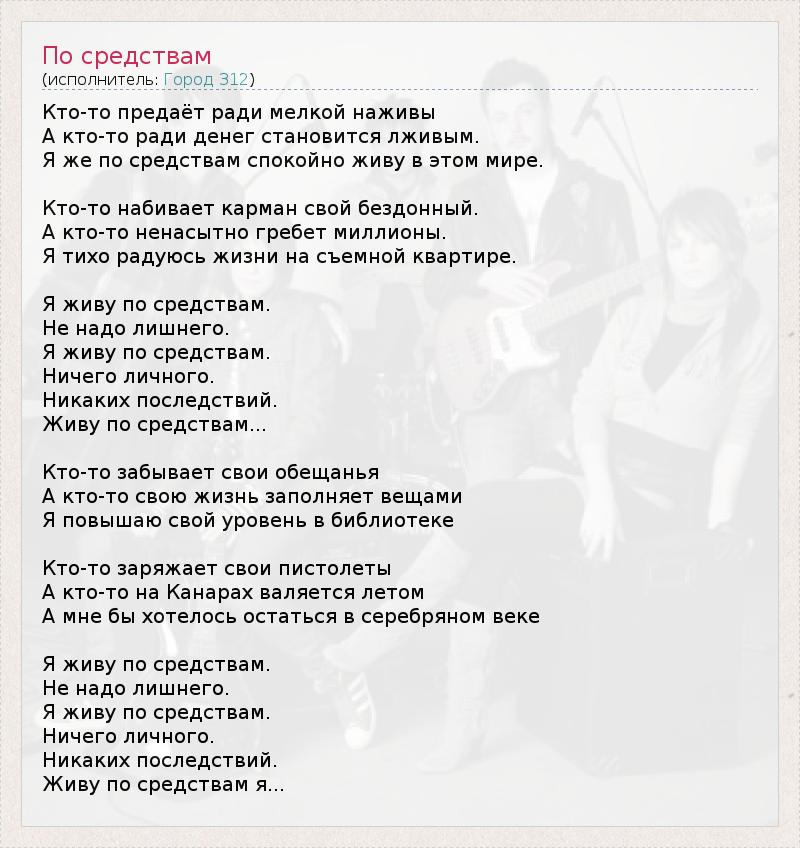 Это интересно:«Город 312» (часто: «Город», «Горожане») - группа из города Бишкек (Киргизия), играющая поп-рок.Состав группы:Ая - вокал (консерватория по классу эстрадного вокала) Маша - гитара (частная школа игры на гитаре) Дим - клавишные (бэк-вокал; отделение хорового дирижирования) Леон - бас, бэк-вокал (эстрадное отделение музыкального училища по классу бас-гитары) До июля 2009 года барабанщиком... продолжение