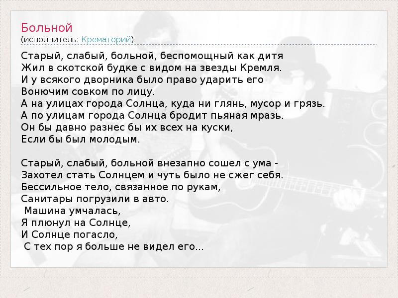 Старый, слабый, больной, беспомощный как дитя Жил в скотской будке с видом на звезды Кремля. И у всякого дворника было право ударить его Вонючим совком по лицу. А на улицах города Солнца, куда ни глянь, мусор и грязь. А по улицам города Солнца бродит пьяная мразь. Он бы давно разнес бы их всех на куски, Если бы был молодым. Старый, слабый, больной внезапно сошел с ума - Захотел стать Солнцем и чуть было не сжег себя. Бессильное тело, связанное по рукам, Санитары погрузили в авто. Машина умчалась, Я плюнул на Солнце, И Солнце погасло, С тех пор я больше не видел его...