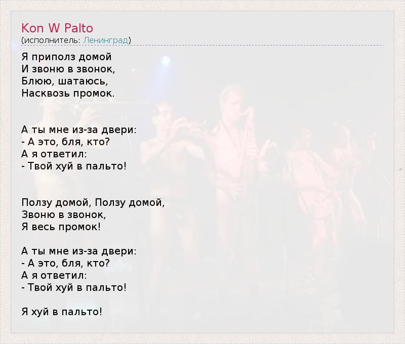 Я приполз домой И звоню в звонок, Блюю, шатаюсь, Насквозь промок. А ты мне из-за двери: - А это, бля, кто? А я ответил: - Твой хуй в пальто! Ползу домой, Ползу домой, Звоню в звонок, Я весь промок! А ты мне из-за двери: - А это, бля, кто? А я ответил: - Твой хуй в пальто! Я хуй в пальто!
