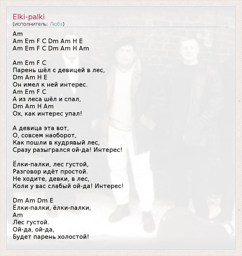 Am Am Em F C Dm Am H E Am Em F C Dm Am H Am Am Em F C Парень шёл с девицей в лес, Dm Am H E Он имел к ней интерес. Am Em F C А из леса шёл и спал, Dm Am H Am Ох, как интерес упал! А девица эта вот, О, совсем наоборот, Как пошли в кудрявый лес, Сразу разыгрался ой-да! Интерес! Ёлки-палки, лес густой, Разговор идёт простой. Не ходите, девки, в лес, Коли у вас слабый ой-да! Интерес! Dm Am Dm E Ёлки-палки, ёлки-палки, Am Лес густой. Ой-да, ой-да, Будет парень холостой!
