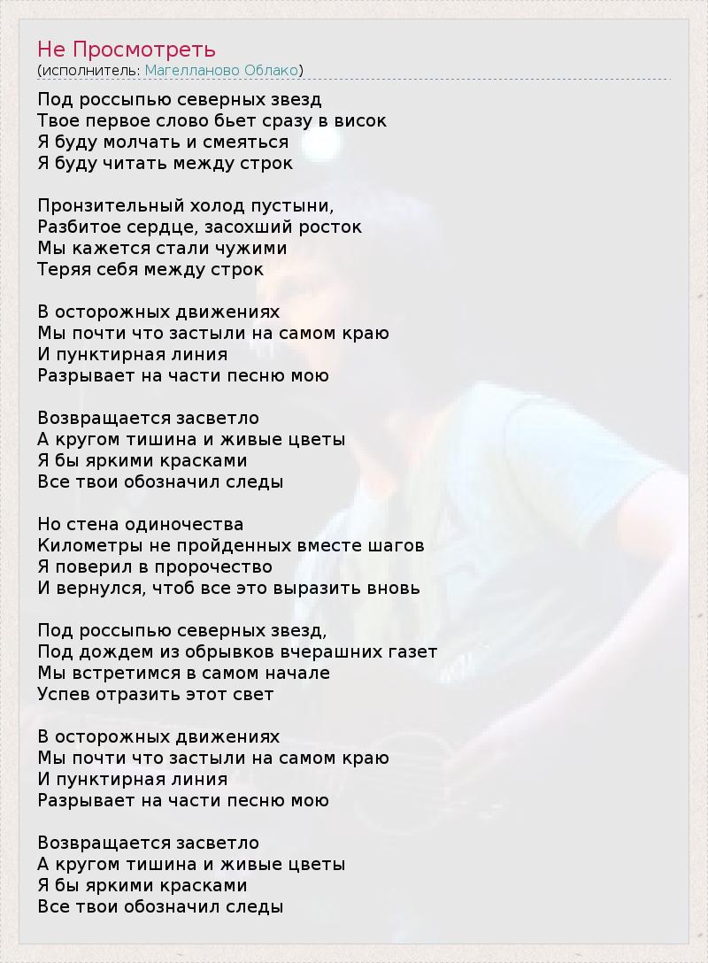 Под россыпью северных звезд Твое первое слово бьет сразу в висок Я буду молчать и смеяться Я буду читать между строк Пронзительный холод пустыни, Разбитое сердце, засохший росток Мы кажется стали чужими Теряя себя между строк В осторожных движениях Мы почти что застыли на самом краю И пунктирная линия Разрывает на части песню мою Возвращается засветло А кругом тишина и живые цветы Я бы яркими красками Все твои обозначил следы Но стена одиночества Километры не пройденных вместе шагов Я поверил в пророчество И вернулся, чтоб все это выразить вновь Под россыпью северных звезд, Под дождем из обрывков вчерашних газет Мы встретимся в самом начале Успев отразить этот свет В осторожных движениях Мы почти что застыли на самом краю И пунктирная линия Разрывает на части песню мою Возвращается засветло А кругом тишина и живые цветы Я бы яркими красками Все твои обозначил следы