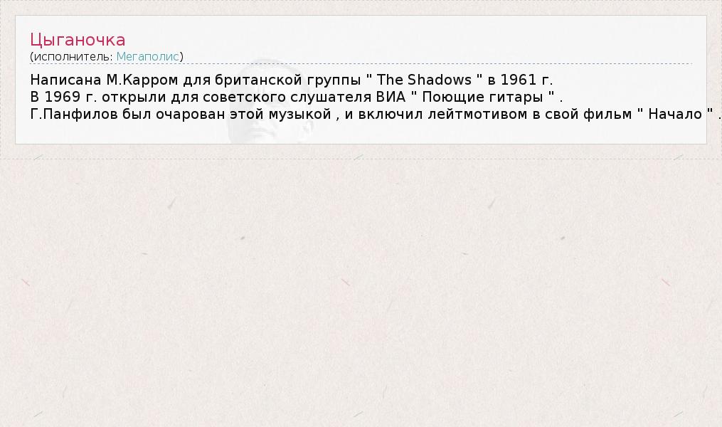 Написана М.Карром для британской группы " The Shadows " в 1961 г. В 1969 г. открыли для советского слушателя ВИА " Поющие гитары " . Г.Панфилов был очарован этой музыкой , и включил лейтмотивом в свой фильм " Начало " .