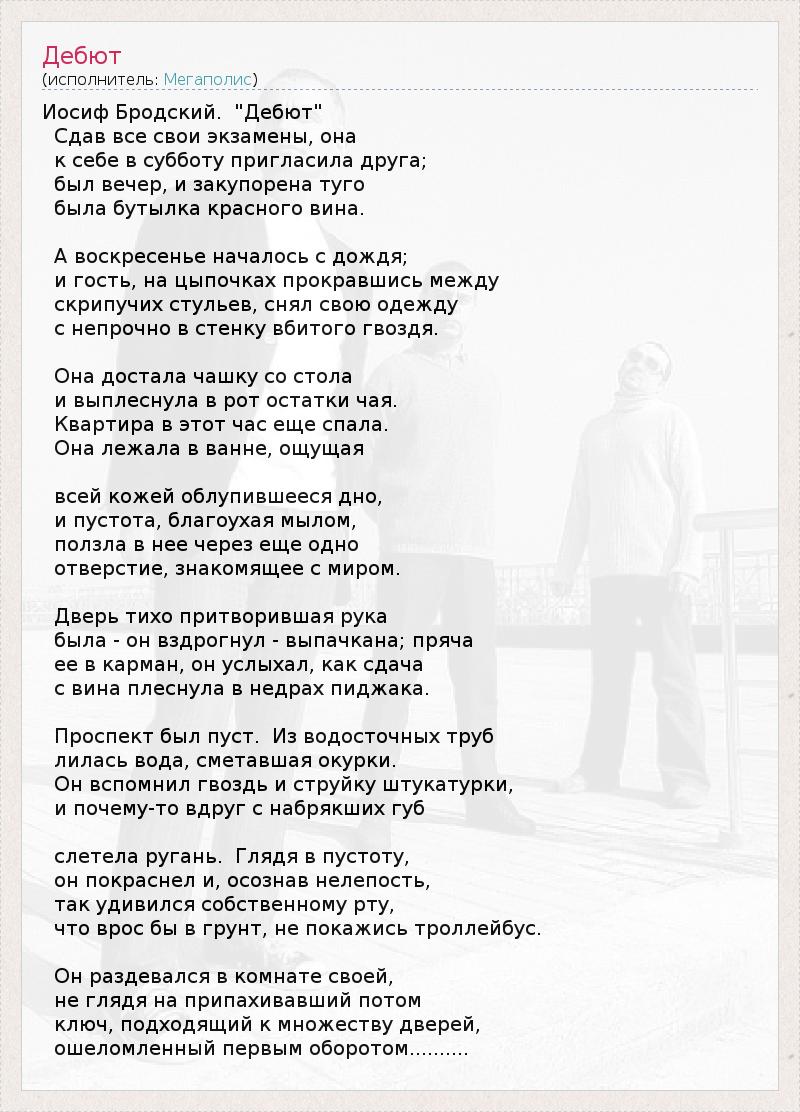 Иосиф Бродский. "Дебют" Сдав все свои экзамены, она к себе в субботу пригласила друга; был вечер, и закупорена туго была бутылка красного вина. А воскресенье началось с дождя; и гость, на цыпочках прокравшись между скрипучих стульев, снял свою одежду с непрочно в стенку вбитого гвоздя. Она достала чашку со стола и выплеснула в рот остатки чая. Квартира в этот час еще спала. Она лежала в ванне, ощущая всей кожей облупившееся дно, и пустота, благоухая мылом, ползла в нее через еще одно отверстие, знакомящее с миром. Дверь тихо притворившая рука была - он вздрогнул - выпачкана; пряча ее в карман, он услыхал, как сдача с вина плеснула в недрах пиджака. Проспект был пуст. Из водосточных труб лилась вода, сметавшая окурки. Он вспомнил гвоздь и струйку штукатурки, и почему-то вдруг с набрякших губ слетела ругань. Глядя в пустоту, он покраснел и, осознав нелепость, так удивился собственному рту, что врос бы в грунт, не покажись троллейбус. Он раздевался в комнате своей, не глядя на припахивавший потом ключ, подходящий к множеству дверей, ошеломленный первым оборотом..........