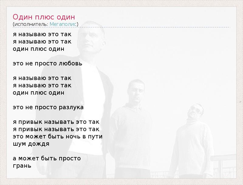 я называю это так я называю это так один плюс один это не просто любовь я называю это так я называю это так один плюс один это не просто разлука я привык называть это так я привык называть это так это может быть ночь в пути шум дождя а может быть просто грань