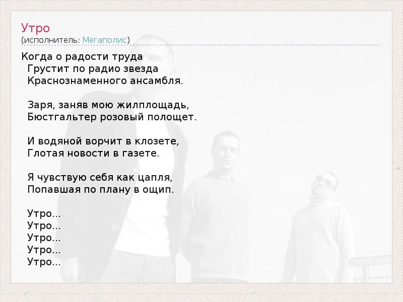 Когда о радости труда Грустит по радио звезда Краснознаменного ансамбля. Заря, заняв мою жилплощадь, Бюстгальтер розовый полощет. И водяной ворчит в клозете, Глотая новости в газете. Я чувствую себя как цапля, Попавшая по плану в ощип. Утро... Утро... Утро... Утро... Утро...