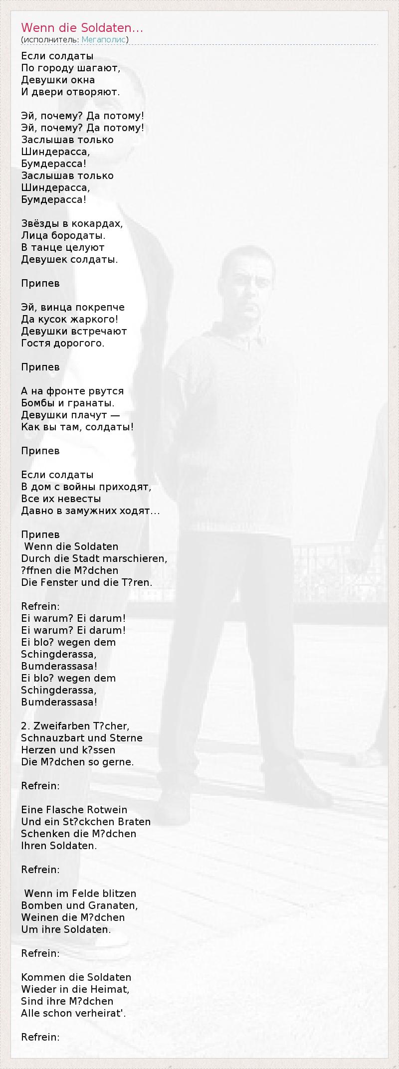 Если солдаты По городу шагают, Девушки окна И двери отворяют. Эй, почему? Да потому! Эй, почему? Да потому! Заслышав только Шиндерасса, Бумдерасса! Заслышав только Шиндерасса, Бумдерасса! Звёзды в кокардах, Лица бородаты. В танце целуют Девушек солдаты. Припев Эй, винца покрепче Да кусок жаркого! Девушки встречают Гостя дорогого. Припев А на фронте рвутся Бомбы и гранаты. Девушки плачут — Как вы там, солдаты! Припев Если солдаты В дом с войны приходят, Все их невесты Давно в замужних ходят… Припев Wenn die Soldaten Durch die Stadt marschieren, ?ffnen die M?dchen Die Fenster und die T?ren. Refrein: Ei warum? Ei darum! Ei warum? Ei darum! Ei blo? wegen dem Schingderassa, Bumderassasa! Ei blo? wegen dem Schingderassa, Bumderassasa! 2. Zweifarben T?cher, Schnauzbart und Sterne Herzen und k?ssen Die M?dchen so gerne. Refrein: Eine Flasche Rotwein Und ein St?ckchen Braten Schenken die M?dchen Ihren Soldaten. Refrein: Wenn im Felde blitzen Bomben und Granaten, Weinen die M?dchen Um ihre Soldaten. Refrein: Kommen die Soldaten Wieder in die Heimat, Sind ihre M?dchen Alle schon verheirat'. Refrein: