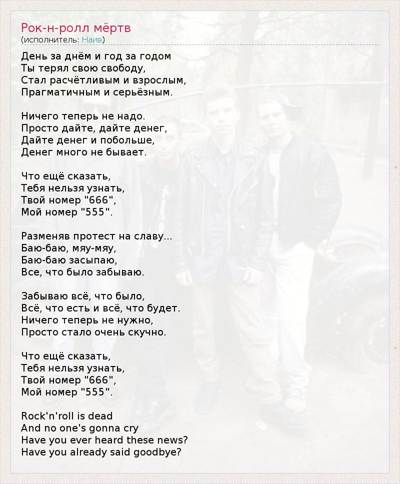 День за днём и год за годом Ты терял свою свободу, Стал расчётливым и взрослым, Прагматичным и серьёзным. Ничего теперь не надо. Просто дайте, дайте денег, Дайте денег и побольше, Денег много не бывает. Что ещё сказать, Тебя нельзя узнать, Твой номер "666", Мой номер "555". Разменяв протест на славу... Баю-баю, мяу-мяу, Баю-баю засыпаю, Все, что было забываю. Забываю всё, что было, Всё, что есть и всё, что будет. Ничего теперь не нужно, Просто стало очень скучно. Что ещё сказать, Тебя нельзя узнать, Твой номер "666", Мой номер "555". Rock'n'roll is dead And no one's gonna cry Have you ever heard these news? Have you already said goodbye?