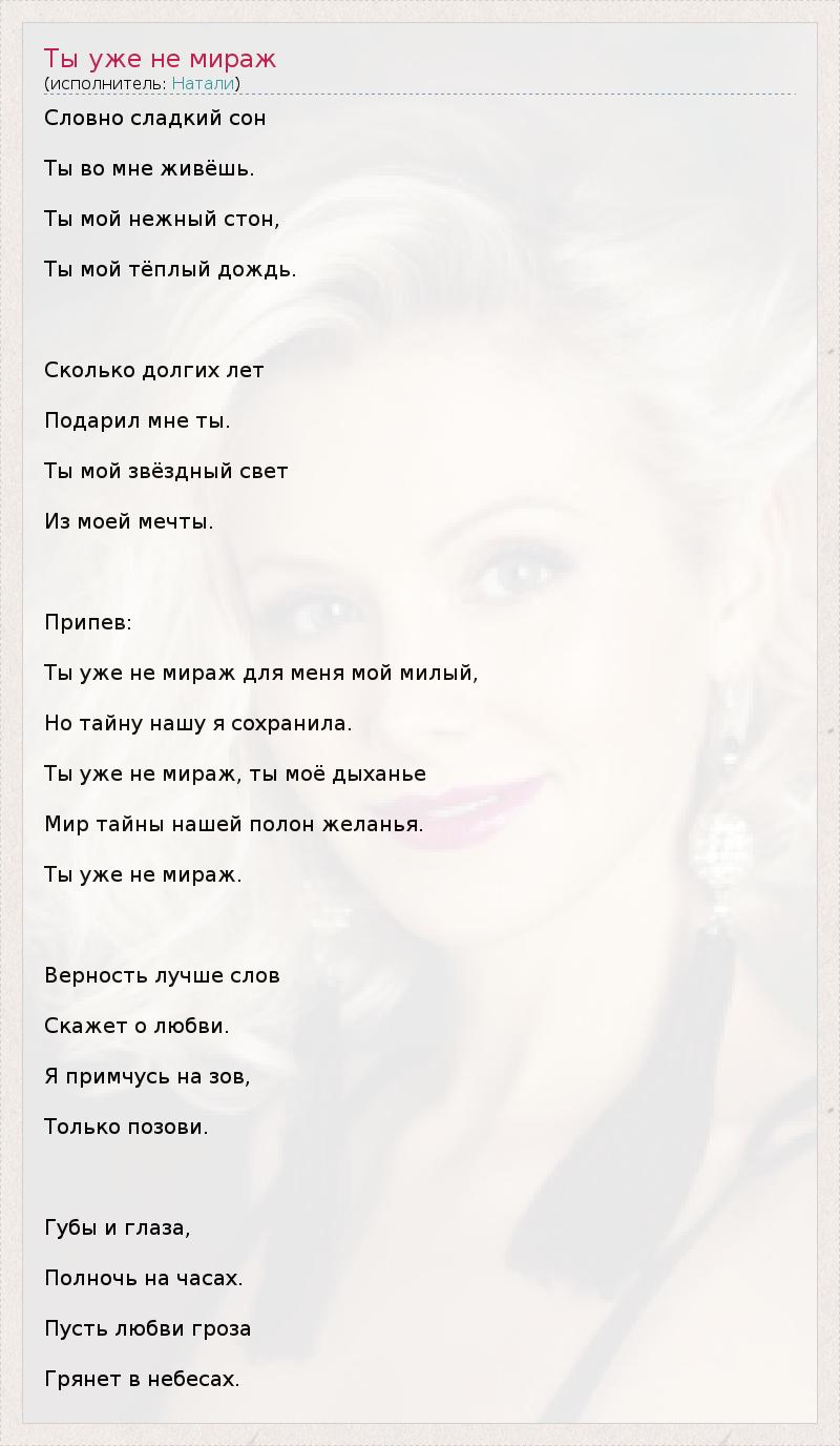 Словно сладкий сон Ты во мне живёшь. Ты мой нежный стон, Ты мой тёплый дождь. Сколько долгих лет Подарил мне ты. Ты мой звёздный свет Из моей мечты. Припев: Ты уже не мираж для меня мой милый, Но тайну нашу я сохранила. Ты уже не мираж, ты моё дыханье Мир тайны нашей полон желанья. Ты уже не мираж. Верность лучше слов Скажет о любви. Я примчусь на зов, Только позови. Губы и глаза, Полночь на часах. Пусть любви гроза Грянет в небесах.