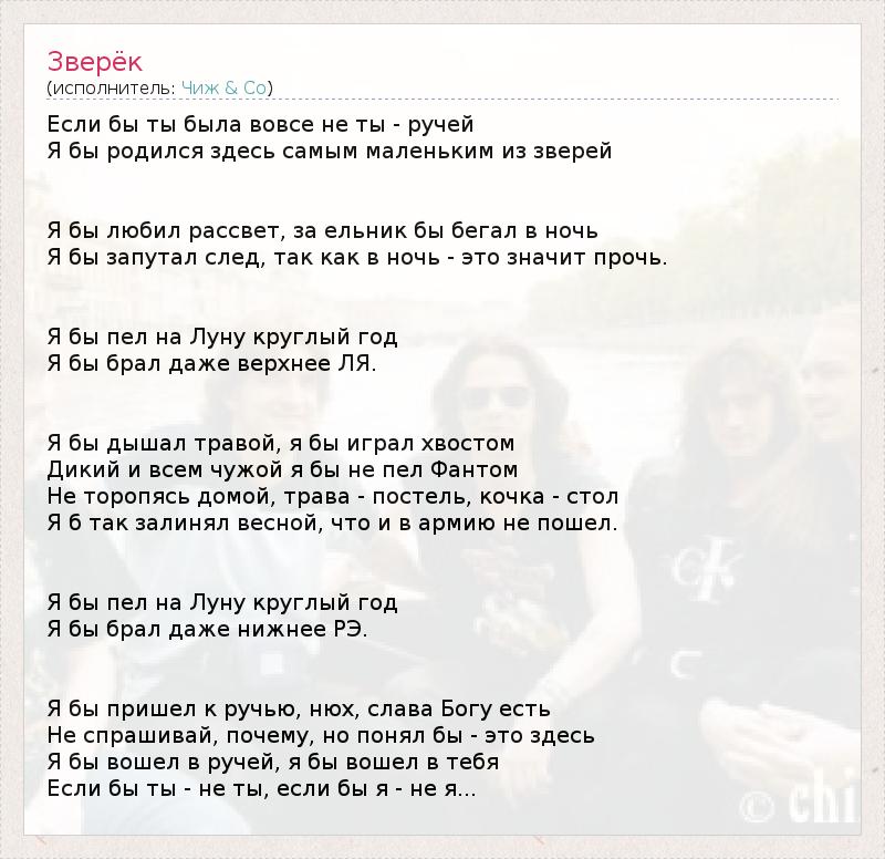 Если бы ты была вовсе не ты - ручей Я бы родился здесь самым маленьким из зверей Я бы любил рассвет, за ельник бы бегал в ночь Я бы запутал след, так как в ночь - это значит прочь. Я бы пел на Луну круглый год Я бы брал даже верхнее ЛЯ. Я бы дышал травой, я бы играл хвостом Дикий и всем чужой я бы не пел Фантом Не торопясь домой, трава - постель, кочка - стол Я б так залинял весной, что и в армию не пошел. Я бы пел на Луну круглый год Я бы брал даже нижнее РЭ. Я бы пришел к ручью, нюх, слава Богу есть Не спрашивай, почему, но понял бы - это здесь Я бы вошел в ручей, я бы вошел в тебя Если бы ты - не ты, если бы я - не я...