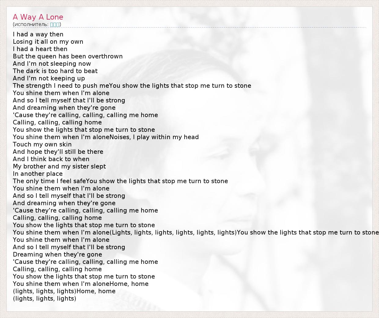I had a way then Losing it all on my own I had a heart then But the queen has been overthrown And I'm not sleeping now The dark is too hard to beat And I'm not keeping up The strength I need to push meYou show the lights that stop me turn to stone You shine them when I'm alone And so I tell myself that I'll be strong And dreaming when they're gone 'Cause they're calling, calling, calling me home Calling, calling, calling home You show the lights that stop me turn to stone You shine them when I'm aloneNoises, I play within my head Touch my own skin And hope they'll still be there And I think back to when My brother and my sister slept In another place The only time I feel safeYou show the lights that stop me turn to stone You shine them when I'm alone And so I tell myself that I'll be strong And dreaming when they're gone 'Cause they're calling, calling, calling me home Calling, calling, calling home You show the lights that stop me turn to stone You shine them when I'm alone(Lights, lights, lights, lights, lights, lights)You show the lights that stop me turn to stone You shine them when I'm alone And so I tell myself that I'll be strong Dreaming when they're gone 'Cause they're calling, calling, calling me home Calling, calling, calling home You show the lights that stop me turn to stone You shine them when I'm aloneHome, home (lights, lights, lights)Home, home (lights, lights, lights)