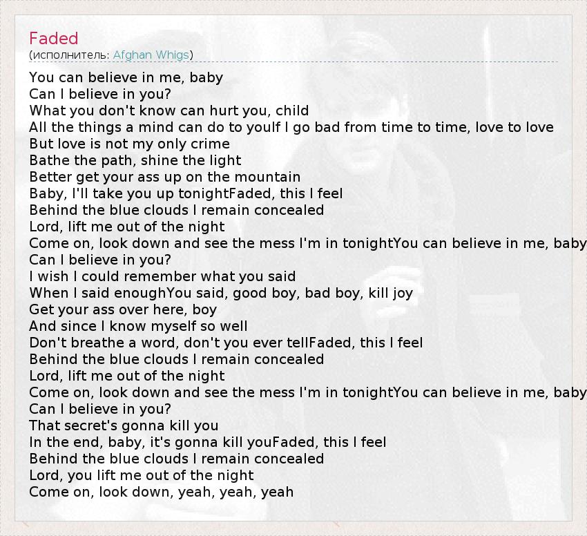You can believe in me, baby Can I believe in you? What you don't know can hurt you, child All the things a mind can do to youIf I go bad from time to time, love to love But love is not my only crime Bathe the path, shine the light Better get your ass up on the mountain Baby, I'll take you up tonightFaded, this I feel Behind the blue clouds I remain concealed Lord, lift me out of the night Come on, look down and see the mess I'm in tonightYou can believe in me, baby Can I believe in you? I wish I could remember what you said When I said enoughYou said, good boy, bad boy, kill joy Get your ass over here, boy And since I know myself so well Don't breathe a word, don't you ever tellFaded, this I feel Behind the blue clouds I remain concealed Lord, lift me out of the night Come on, look down and see the mess I'm in tonightYou can believe in me, baby Can I believe in you? That secret's gonna kill you In the end, baby, it's gonna kill youFaded, this I feel Behind the blue clouds I remain concealed Lord, you lift me out of the night Come on, look down, yeah, yeah, yeah