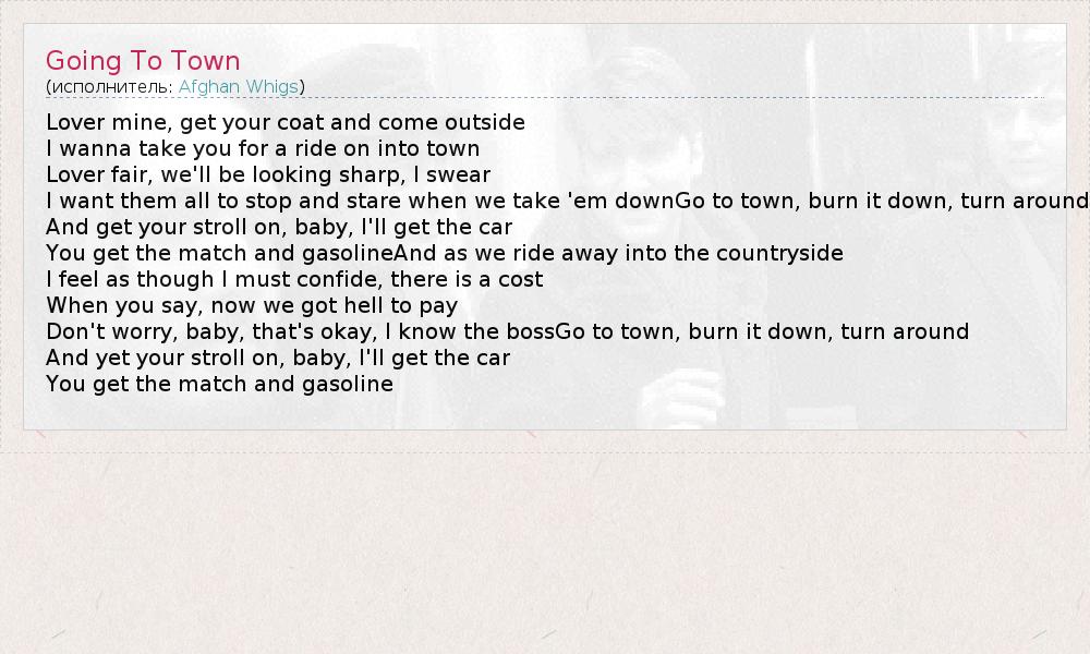 Lover mine, get your coat and come outside I wanna take you for a ride on into town Lover fair, we'll be looking sharp, I swear I want them all to stop and stare when we take 'em downGo to town, burn it down, turn around And get your stroll on, baby, I'll get the car You get the match and gasolineAnd as we ride away into the countryside I feel as though I must confide, there is a cost When you say, now we got hell to pay Don't worry, baby, that's okay, I know the bossGo to town, burn it down, turn around And yet your stroll on, baby, I'll get the car You get the match and gasoline