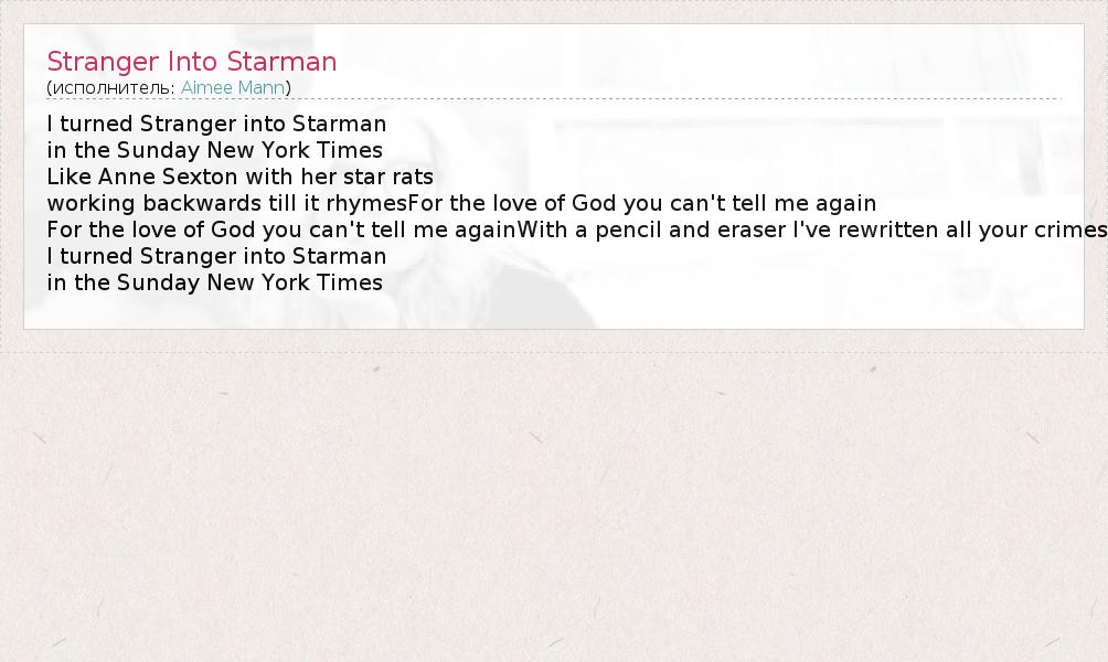 I turned Stranger into Starman in the Sunday New York Times Like Anne Sexton with her star rats working backwards till it rhymesFor the love of God you can't tell me again For the love of God you can't tell me againWith a pencil and eraser I've rewritten all your crimes I turned Stranger into Starman in the Sunday New York Times