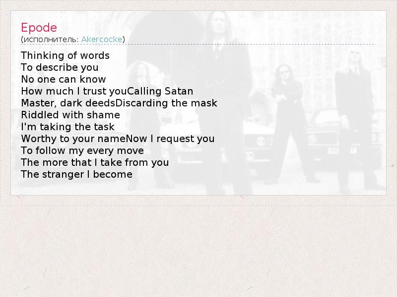 Это интересно:Эта лондонская команда выработала свой собственный стиль, приготовив брутальный дэт-блэк-коктейль с легким привкусом электроники. Кроме того, Akercocke сделали ставку на необычный для металлистов имидж и выходили на сцену одетые, как истинные джентльмены, в парадные костюмы. Группу основали в 1996 году поющий гитарист Джейсон Мендонса и барабанщик Дэвид Грэй, в начале 90-х работавшие вместе... продолжение