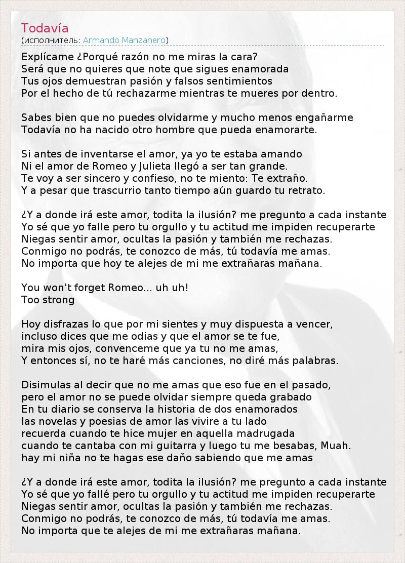 Объясни, почему ты не смотришь мне в глаза? Не хочешь, чтобы я увидел, что ты до сих пор влюблена в меня? Глаза выдают твою страсть и обманчивые чувства, Ты отвергаешь меня, хотя в душе умираешь. Ты прекрасно знаешь, что не сможешь забыть меня, не сможешь предать меня. Не родился еще тот мужчина, что заставит тебя полюбить его. Я любил тебя еще до того, как придумали любовь, Даже чувство Ромео и Джульетты не было так сильно. Я буду искренен с тобой, не стану лгать и признаюсь: я скучаю по тебе. И пусть много воды утекло, я все еще храню твою фотографию. И куда приведет эта любовь, эта хрупкая иллюзия? - спрашиваю я себя. Я знаю, что подвел тебя, но твоя гордость и принципы не позволят тебе вернуться ко мне. Ты отрицаешь, что влюблена, ты скрываешь страсть, отвергая меня. Ты не можешь быть со мной, но я вижу тебя насквозь – ты все еще любишь меня. И не важно, что сегодня ты уходишь прочь, ведь завтра ты будешь скучать по мне. Ты не забудешь своего Ромео, о нет! Любовь слишком сильна! Сегодня ты прячешь свои чувства ко мне, ты намерена победить. Ты говоришь, что ненавидишь меня, что наша любовь в прошлом. Посмотри мне в глаза, докажи мне, что не любишь, И тогда я не стану больше петь для тебя, я не скажу тебе больше ни слова. Ты притворяешься, повторяя, что не любишь меня, что все в прошлом, Но любовь нельзя забыть, она остается запечатленной в памяти навеки. В своем дневнике ты хранишь историю о двух влюбленных, Небольшие рассказы и стихи о любви. Я жил по соседству. Помнишь то утро, когда я сделал тебя женщиной? Я играл тебе на гитаре, а ты целовала меня. Ну же, малыш, не разрушай это, зная, что любишь меня. И куда приведет эта любовь, эта хрупкая иллюзия? - спрашиваю я себя. Я знаю, что подвел тебя, но твоя гордость и принципы не позволят тебе вернуться ко мне. Ты отрицаешь, что влюблена, ты скрываешь страсть, отвергая меня. Ты не можешь быть со мной, но я вижу тебя насквозь – ты все еще любишь меня. И не важно, что сегодня ты уходишь прочь, ведь завтра ты будешь скучать по мне.