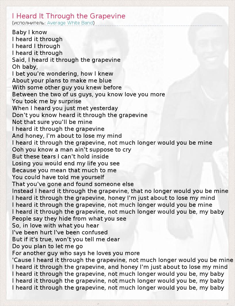Baby I know I heard it through I heard I through I heard it through Said, I heard it through the grapevine Oh baby, I bet you're wondering, how I knew About your plans to make me blue With some other guy you knew before Between the two of us guys, you know love you more You took me by surprise When I heard you just met yesterday Don't you know heard it through the grapevine Not that sure you'll be mine I heard it through the grapevine And honey, I'm about to lose my mind I heard it through the grapevine, not much longer would you be mine Ooh you know a man ain't suppose to cry But these tears I can't hold inside Losing you would end my life you see Because you mean that much to me You could have told me yourself That you've gone and found someone else Instead I heard it through the grapevine, that no longer would you be mine I heard it through the grapevine, honey I'm just about to lose my mind I heard it through the grapevine, not much longer would you be mine I heard it through the grapevine, not much longer would you be, my baby People say they hide from what you see So, in love with what you hear I've been hurt I've been confused But if it's true, won't you tell me dear Do you plan to let me go For another guy who says he loves you more 'Cause I heard it through the grapevine, not much longer would you be mine I heard it through the grapevine, and honey I'm just about to lose my mind I heard it through the grapevine, not much longer would you be, my baby I heard it through the grapevine, not much longer would you be, my baby I heard it through the grapevine, not much longer would you be, my baby