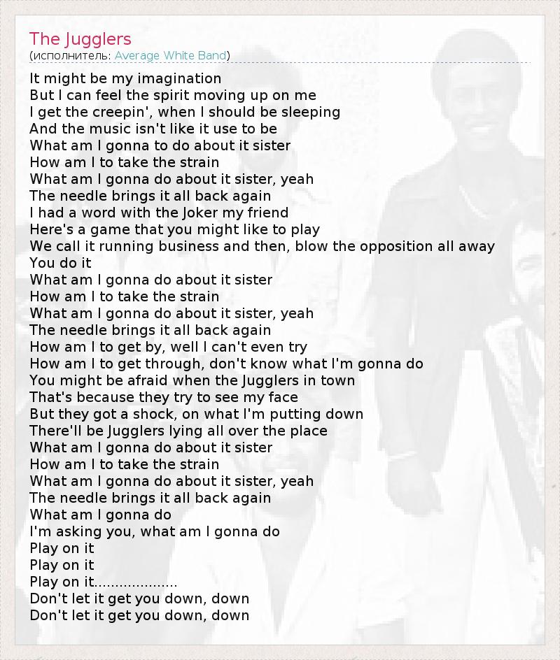 It might be my imagination But I can feel the spirit moving up on me I get the creepin', when I should be sleeping And the music isn't like it use to be What am I gonna to do about it sister How am I to take the strain What am I gonna do about it sister, yeah The needle brings it all back again I had a word with the Joker my friend Here's a game that you might like to play We call it running business and then, blow the opposition all away You do it What am I gonna do about it sister How am I to take the strain What am I gonna do about it sister, yeah The needle brings it all back again How am I to get by, well I can't even try How am I to get through, don't know what I'm gonna do You might be afraid when the Jugglers in town That's because they try to see my face But they got a shock, on what I'm putting down There'll be Jugglers lying all over the place What am I gonna do about it sister How am I to take the strain What am I gonna do about it sister, yeah The needle brings it all back again What am I gonna do I'm asking you, what am I gonna do Play on it Play on it Play on it.................... Don't let it get you down, down Don't let it get you down, down