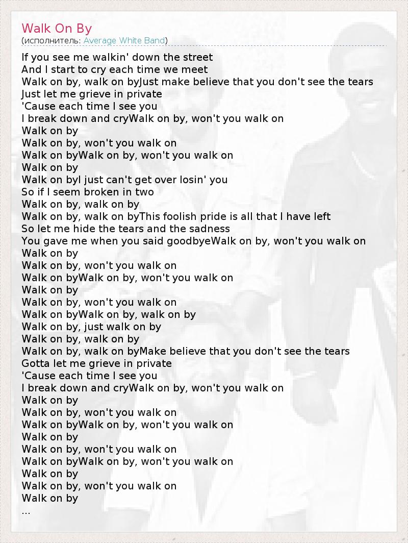 If you see me walkin' down the street And I start to cry each time we meet Walk on by, walk on byJust make believe that you don't see the tears Just let me grieve in private 'Cause each time I see you I break down and cryWalk on by, won't you walk on Walk on by Walk on by, won't you walk on Walk on byWalk on by, won't you walk on Walk on by Walk on byI just can't get over losin' you So if I seem broken in two Walk on by, walk on by Walk on by, walk on byThis foolish pride is all that I have left So let me hide the tears and the sadness You gave me when you said goodbyeWalk on by, won't you walk on Walk on by Walk on by, won't you walk on Walk on byWalk on by, won't you walk on Walk on by Walk on by, won't you walk on Walk on byWalk on by, walk on by Walk on by, just walk on by Walk on by, walk on by Walk on by, walk on byMake believe that you don't see the tears Gotta let me grieve in private 'Cause each time I see you I break down and cryWalk on by, won't you walk on Walk on by Walk on by, won't you walk on Walk on byWalk on by, won't you walk on Walk on by Walk on by, won't you walk on Walk on byWalk on by, won't you walk on Walk on by Walk on by, won't you walk on Walk on by ...