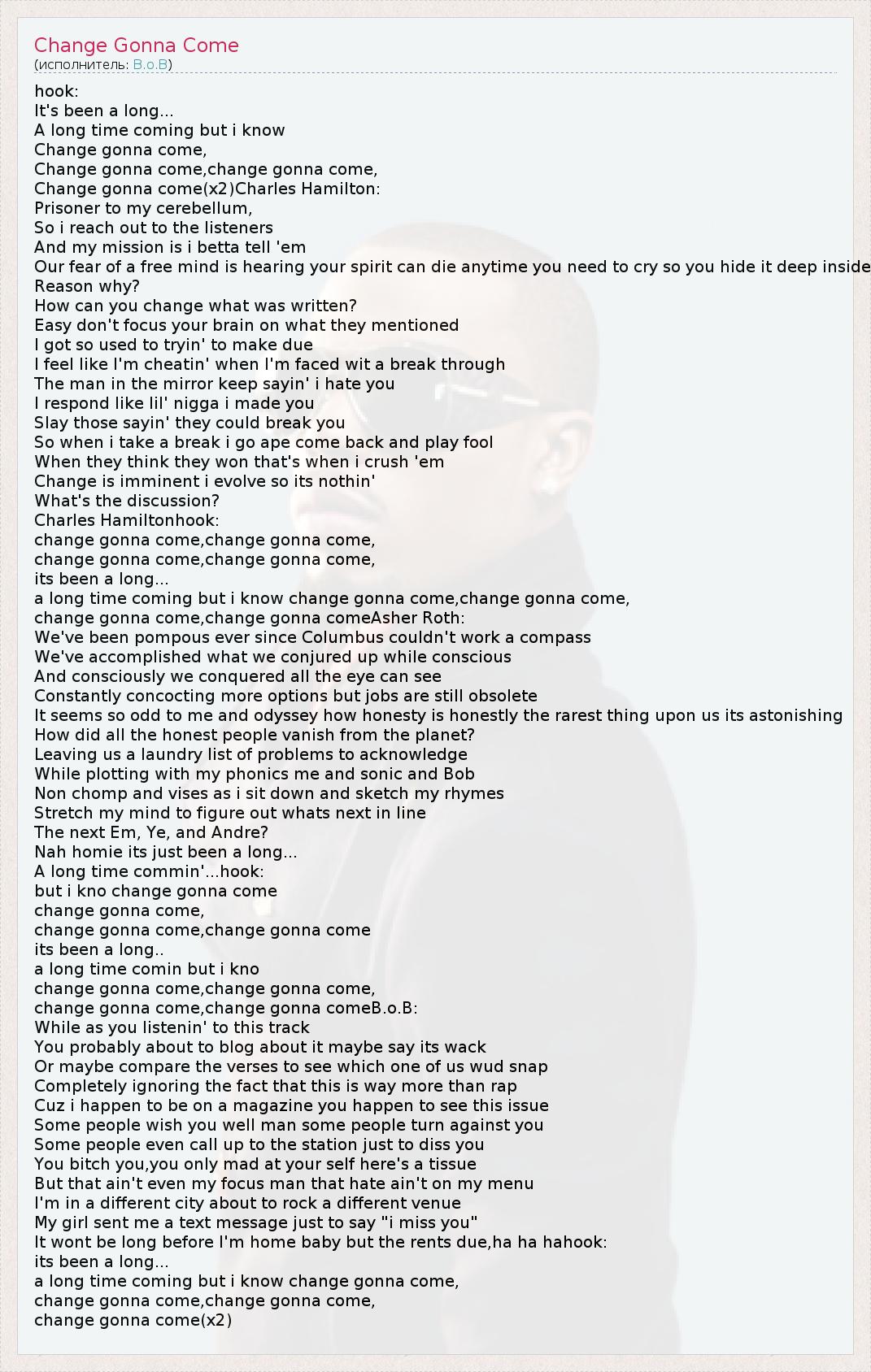 hook: It's been a long... A long time coming but i know Change gonna come, Change gonna come,change gonna come, Change gonna come(x2)Charles Hamilton: Prisoner to my cerebellum, So i reach out to the listeners And my mission is i betta tell 'em Our fear of a free mind is hearing your spirit can die anytime you need to cry so you hide it deep inside Reason why? How can you change what was written? Easy don't focus your brain on what they mentioned I got so used to tryin' to make due I feel like I'm cheatin' when I'm faced wit a break through The man in the mirror keep sayin' i hate you I respond like lil' nigga i made you Slay those sayin' they could break you So when i take a break i go ape come back and play fool When they think they won that's when i crush 'em Change is imminent i evolve so its nothin' What's the discussion? Charles Hamiltonhook: change gonna come,change gonna come, change gonna come,change gonna come, its been a long... a long time coming but i know change gonna come,change gonna come, change gonna come,change gonna comeAsher Roth: We've been pompous ever since Columbus couldn't work a compass We've accomplished what we conjured up while conscious And consciously we conquered all the eye can see Constantly concocting more options but jobs are still obsolete It seems so odd to me and odyssey how honesty is honestly the rarest thing upon us its astonishing How did all the honest people vanish from the planet? Leaving us a laundry list of problems to acknowledge While plotting with my phonics me and sonic and Bob Non chomp and vises as i sit down and sketch my rhymes Stretch my mind to figure out whats next in line The next Em, Ye, and Andre? Nah homie its just been a long... A long time commin'...hook: but i kno change gonna come change gonna come, change gonna come,change gonna come its been a long.. a long time comin but i kno change gonna come,change gonna come, change gonna come,change gonna comeB.o.B: While as you listenin' to this track You probably about to blog about it maybe say its wack Or maybe compare the verses to see which one of us wud snap Completely ignoring the fact that this is way more than rap Cuz i happen to be on a magazine you happen to see this issue Some people wish you well man some people turn against you Some people even call up to the station just to diss you You bitch you,you only mad at your self here's a tissue But that ain't even my focus man that hate ain't on my menu I'm in a different city about to rock a different venue My girl sent me a text message just to say "i miss you" It wont be long before I'm home baby but the rents due,ha ha hahook: its been a long... a long time coming but i know change gonna come, change gonna come,change gonna come, change gonna come(x2)