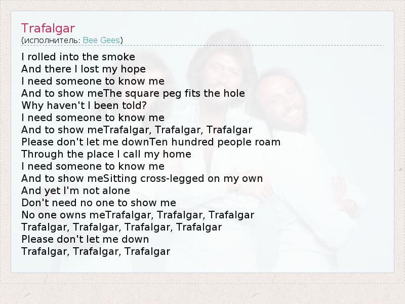 I rolled into the smoke And there I lost my hope I need someone to know me And to show meThe square peg fits the hole Why haven't I been told? I need someone to know me And to show meTrafalgar, Trafalgar, Trafalgar Please don't let me downTen hundred people roam Through the place I call my home I need someone to know me And to show meSitting cross-legged on my own And yet I'm not alone Don't need no one to show me No one owns meTrafalgar, Trafalgar, Trafalgar Trafalgar, Trafalgar, Trafalgar, Trafalgar Please don't let me down Trafalgar, Trafalgar, Trafalgar
