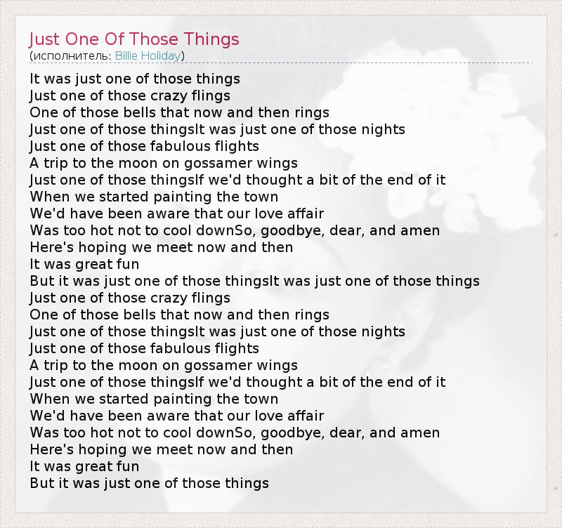 It was just one of those things Just one of those crazy flings One of those bells that now and then rings Just one of those thingsIt was just one of those nights Just one of those fabulous flights A trip to the moon on gossamer wings Just one of those thingsIf we'd thought a bit of the end of it When we started painting the town We'd have been aware that our love affair Was too hot not to cool downSo, goodbye, dear, and amen Here's hoping we meet now and then It was great fun But it was just one of those thingsIt was just one of those things Just one of those crazy flings One of those bells that now and then rings Just one of those thingsIt was just one of those nights Just one of those fabulous flights A trip to the moon on gossamer wings Just one of those thingsIf we'd thought a bit of the end of it When we started painting the town We'd have been aware that our love affair Was too hot not to cool downSo, goodbye, dear, and amen Here's hoping we meet now and then It was great fun But it was just one of those things