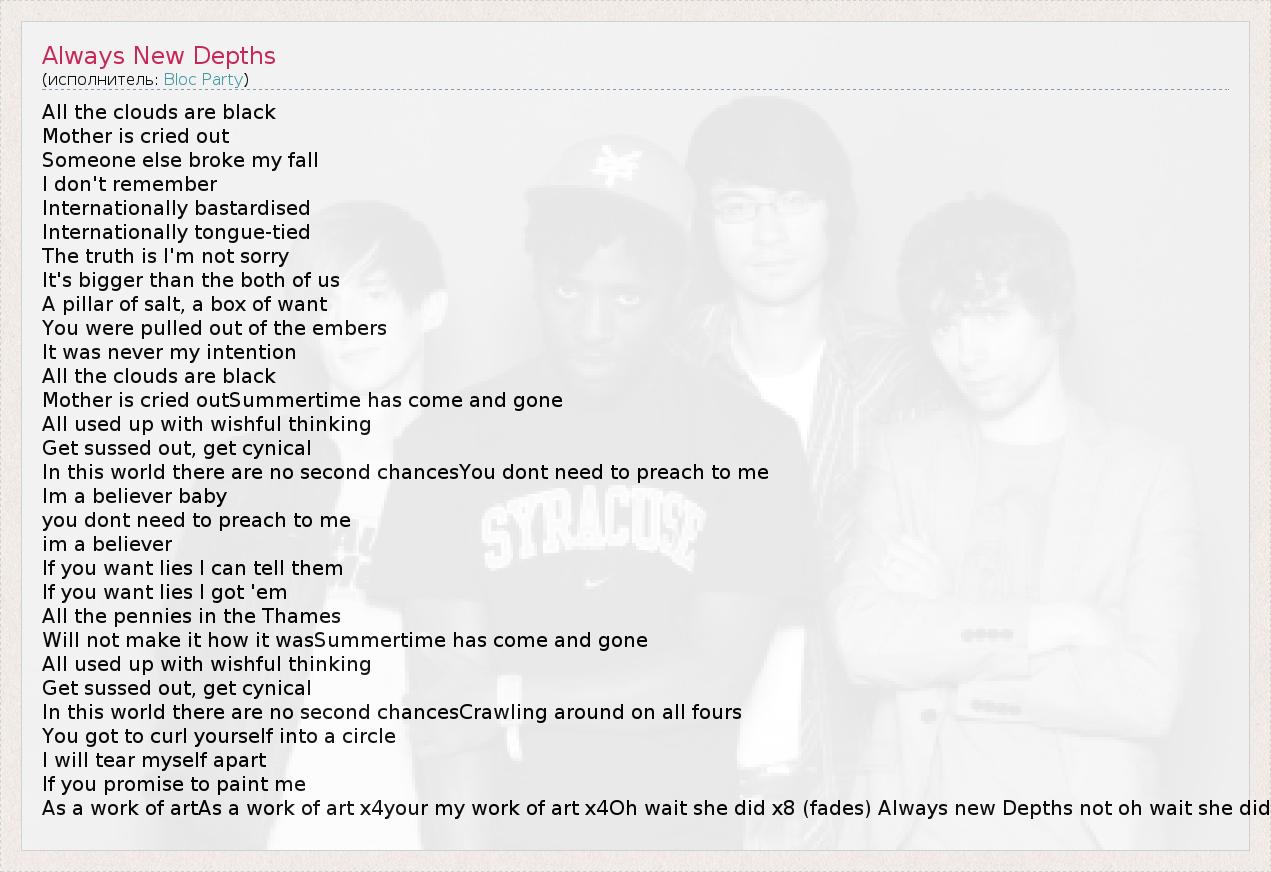 As a work of artAs a work of art x4your my work of art x4Oh wait she did x8 (fades) Always new Depths not oh wait she did