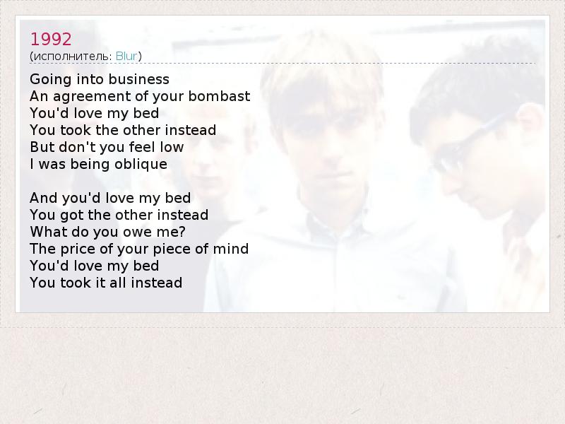 Going into business An agreement of your bombast You'd love my bed You took the other instead But don't you feel low I was being oblique And you'd love my bed You got the other instead What do you owe me? The price of your piece of mind You'd love my bed You took it all instead