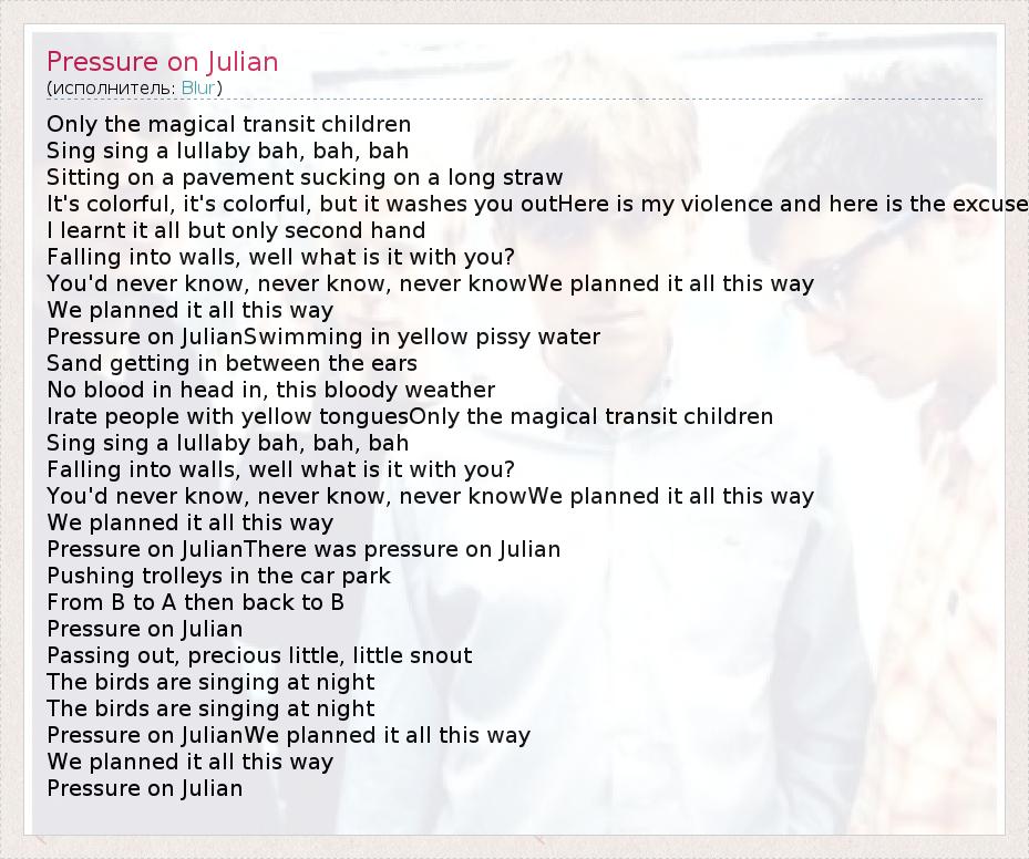 А как ты думаешь, о чем песня "Pressure on Julian" ?