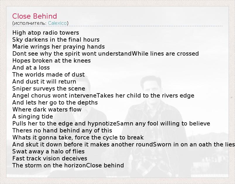 Это интересно:Calexico — современный американский музыкальный коллектив, играющий альтернативное кантри с заметным влиянием мексиканских и латиноамериканских мотивов. Группа была образована в 1996 году вокалистом и гитаристом Джоуи Бёрнсом и барабанщиком Джоном Конвертино в городе Таксон штата Аризона.Текущий состав:Джоуи Бёрнс (Joey Burns) — вокал, гитараДжон Конвертино (John Convertino) — ударные... продолжение