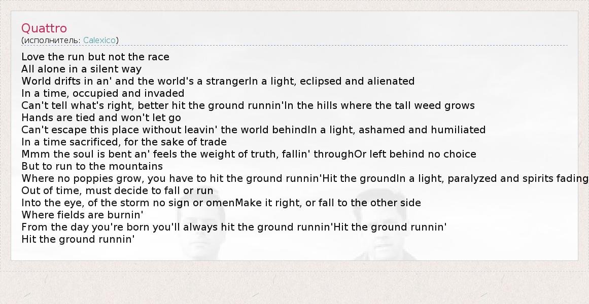 Это интересно:Calexico — современный американский музыкальный коллектив, играющий альтернативное кантри с заметным влиянием мексиканских и латиноамериканских мотивов. Группа была образована в 1996 году вокалистом и гитаристом Джоуи Бёрнсом и барабанщиком Джоном Конвертино в городе Таксон штата Аризона.Текущий состав:Джоуи Бёрнс (Joey Burns) — вокал, гитараДжон Конвертино (John Convertino) — ударные... продолжение