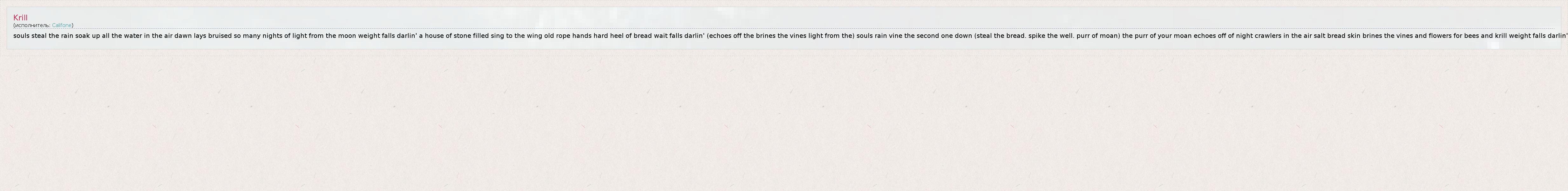 souls steal the rain soak up all the water in the air dawn lays bruised so many nights of light from the moon weight falls darlin' a house of stone filled sing to the wing old rope hands hard heel of bread wait falls darlin' (echoes off the brines the vines light from the) souls rain vine the second one down (steal the bread. spike the well. purr of moan) the purr of your moan echoes off of night crawlers in the air salt bread skin brines the vines and flowers for bees and krill weight falls darlin'
