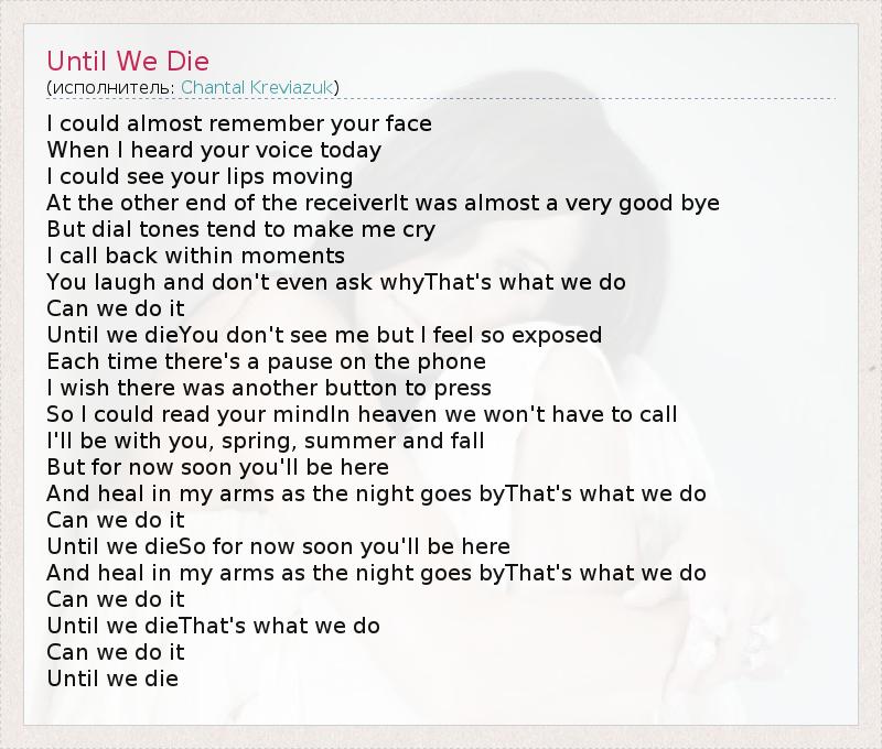 I could almost remember your face When I heard your voice today I could see your lips moving At the other end of the receiverIt was almost a very good bye But dial tones tend to make me cry I call back within moments You laugh and don't even ask whyThat's what we do Can we do it Until we dieYou don't see me but I feel so exposed Each time there's a pause on the phone I wish there was another button to press So I could read your mindIn heaven we won't have to call I'll be with you, spring, summer and fall But for now soon you'll be here And heal in my arms as the night goes byThat's what we do Can we do it Until we dieSo for now soon you'll be here And heal in my arms as the night goes byThat's what we do Can we do it Until we dieThat's what we do Can we do it Until we die