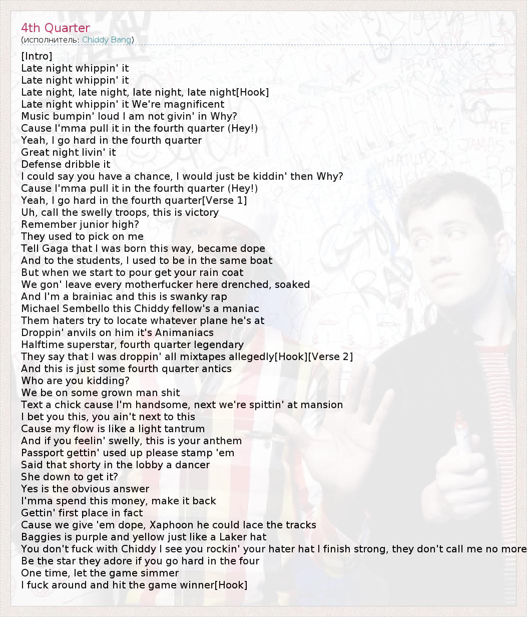 [Intro] Late night whippin' it Late night whippin' it Late night, late night, late night, late night[Hook] Late night whippin' it We're magnificent Music bumpin' loud I am not givin' in Why? Cause I'mma pull it in the fourth quarter (Hey!) Yeah, I go hard in the fourth quarter Great night livin' it Defense dribble it I could say you have a chance, I would just be kiddin' then Why? Cause I'mma pull it in the fourth quarter (Hey!) Yeah, I go hard in the fourth quarter[Verse 1] Uh, call the swelly troops, this is victory Remember junior high? They used to pick on me Tell Gaga that I was born this way, became dope And to the students, I used to be in the same boat But when we start to pour get your rain coat We gon' leave every motherfucker here drenched, soaked And I'm a brainiac and this is swanky rap Michael Sembello this Chiddy fellow's a maniac Them haters try to locate whatever plane he's at Droppin' anvils on him it's Animaniacs Halftime superstar, fourth quarter legendary They say that I was droppin' all mixtapes allegedly[Hook][Verse 2] And this is just some fourth quarter antics Who are you kidding? We be on some grown man shit Text a chick cause I'm handsome, next we're spittin' at mansion I bet you this, you ain't next to this Cause my flow is like a light tantrum And if you feelin' swelly, this is your anthem Passport gettin' used up please stamp 'em Said that shorty in the lobby a dancer She down to get it? Yes is the obvious answer I'mma spend this money, make it back Gettin' first place in fact Cause we give 'em dope, Xaphoon he could lace the tracks Baggies is purple and yellow just like a Laker hat You don't fuck with Chiddy I see you rockin' your hater hat I finish strong, they don't call me no more Be the star they adore if you go hard in the four One time, let the game simmer I fuck around and hit the game winner[Hook]