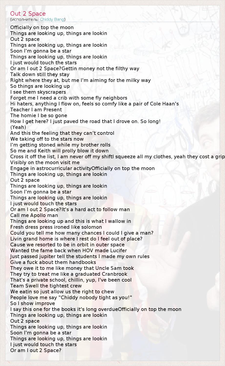 Officially on top the moon Things are looking up, things are lookin Out 2 space Things are looking up, things are lookin Soon I'm gonna be a star Things are looking up, things are lookin I just would touch the stars Or am I out 2 Space?Gettin money not the filthy way Talk down still they stay Right where they at, but me I'm aiming for the milky way So things are looking up I see them skyscrapers Forget me I need a crib with some fly neighbors Hi haters, anything I flow on, feels so comfy like a pair of Cole Haan's Teacher I am Present The homie I be so gone How I get here? I just paved the road that I drove on. So long! (Yeah) And this the feeling that they can't control We taking off to the stars now I'm getting stoned while my brother rolls So me and Keith will prolly blow it down Cross it off the list, I am never off my shiftI squeeze all my clothes, yeah they cost a grip Visibly on the moon visit me Engage in astrocurricular activityOfficially on top the moon Things are looking up, things are lookin Out 2 space Things are looking up, things are lookin Soon I'm gonna be a star Things are looking up, things are lookin I just would touch the stars Or am I out 2 Space?It's a hard act to follow man Call me Apollo man Things are looking up and this is what I wallow in Fresh dress press ironed like solomon Could you tell me how many chances I could I give a man? Livin grand home is where I rest do I feel out of place? Cause we resorted to be in orbit in outer space Wanted the fame back when HOV made Lucifer Just passed jupiter tell the students I made my own rules Give a fuck about them handbooks They owe it to me like money that Uncle Sam took They try to treat me like a graduated Cranbrook That's a private school, chillin, yup, I've been cool Team Swell the tightest crew We eatin so just allow us the right to chew People love me say "Chiddy nobody tight as you!" So I show improve I say this one for the books it's long overdueOfficially on top the moon Things are looking up, things are lookin Out 2 space Things are looking up, things are lookin Soon I'm gonna be a star Things are looking up, things are lookin I just would touch the stars Or am I out 2 Space?