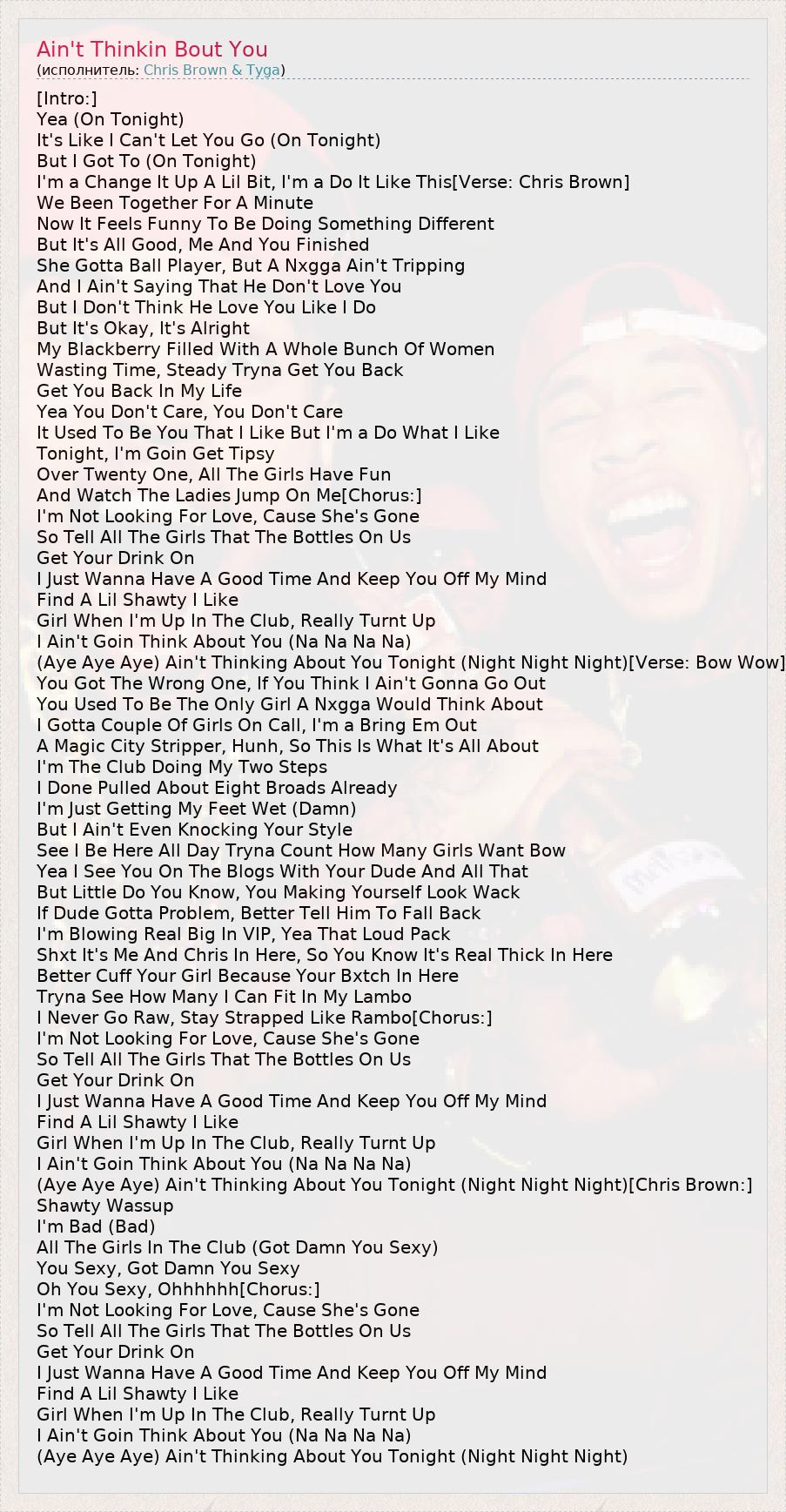 [Intro:] Yea (On Tonight) It's Like I Can't Let You Go (On Tonight) But I Got To (On Tonight) I'm a Change It Up A Lil Bit, I'm a Do It Like This[Verse: Chris Brown] We Been Together For A Minute Now It Feels Funny To Be Doing Something Different But It's All Good, Me And You Finished She Gotta Ball Player, But A Nxgga Ain't Tripping And I Ain't Saying That He Don't Love You But I Don't Think He Love You Like I Do But It's Okay, It's Alright My Blackberry Filled With A Whole Bunch Of Women Wasting Time, Steady Tryna Get You Back Get You Back In My Life Yea You Don't Care, You Don't Care It Used To Be You That I Like But I'm a Do What I Like Tonight, I'm Goin Get Tipsy Over Twenty One, All The Girls Have Fun And Watch The Ladies Jump On Me[Chorus:] I'm Not Looking For Love, Cause She's Gone So Tell All The Girls That The Bottles On Us Get Your Drink On I Just Wanna Have A Good Time And Keep You Off My Mind Find A Lil Shawty I Like Girl When I'm Up In The Club, Really Turnt Up I Ain't Goin Think About You (Na Na Na Na) (Aye Aye Aye) Ain't Thinking About You Tonight (Night Night Night)[Verse: Bow Wow] You Got The Wrong One, If You Think I Ain't Gonna Go Out You Used To Be The Only Girl A Nxgga Would Think About I Gotta Couple Of Girls On Call, I'm a Bring Em Out A Magic City Stripper, Hunh, So This Is What It's All About I'm The Club Doing My Two Steps I Done Pulled About Eight Broads Already I'm Just Getting My Feet Wet (Damn) But I Ain't Even Knocking Your Style See I Be Here All Day Tryna Count How Many Girls Want Bow Yea I See You On The Blogs With Your Dude And All That But Little Do You Know, You Making Yourself Look Wack If Dude Gotta Problem, Better Tell Him To Fall Back I'm Blowing Real Big In VIP, Yea That Loud Pack Shxt It's Me And Chris In Here, So You Know It's Real Thick In Here Better Cuff Your Girl Because Your Bxtch In Here Tryna See How Many I Can Fit In My Lambo I Never Go Raw, Stay Strapped Like Rambo[Chorus:] I'm Not Looking For Love, Cause She's Gone So Tell All The Girls That The Bottles On Us Get Your Drink On I Just Wanna Have A Good Time And Keep You Off My Mind Find A Lil Shawty I Like Girl When I'm Up In The Club, Really Turnt Up I Ain't Goin Think About You (Na Na Na Na) (Aye Aye Aye) Ain't Thinking About You Tonight (Night Night Night)[Chris Brown:] Shawty Wassup I'm Bad (Bad) All The Girls In The Club (Got Damn You Sexy) You Sexy, Got Damn You Sexy Oh You Sexy, Ohhhhhh[Chorus:] I'm Not Looking For Love, Cause She's Gone So Tell All The Girls That The Bottles On Us Get Your Drink On I Just Wanna Have A Good Time And Keep You Off My Mind Find A Lil Shawty I Like Girl When I'm Up In The Club, Really Turnt Up I Ain't Goin Think About You (Na Na Na Na) (Aye Aye Aye) Ain't Thinking About You Tonight (Night Night Night)