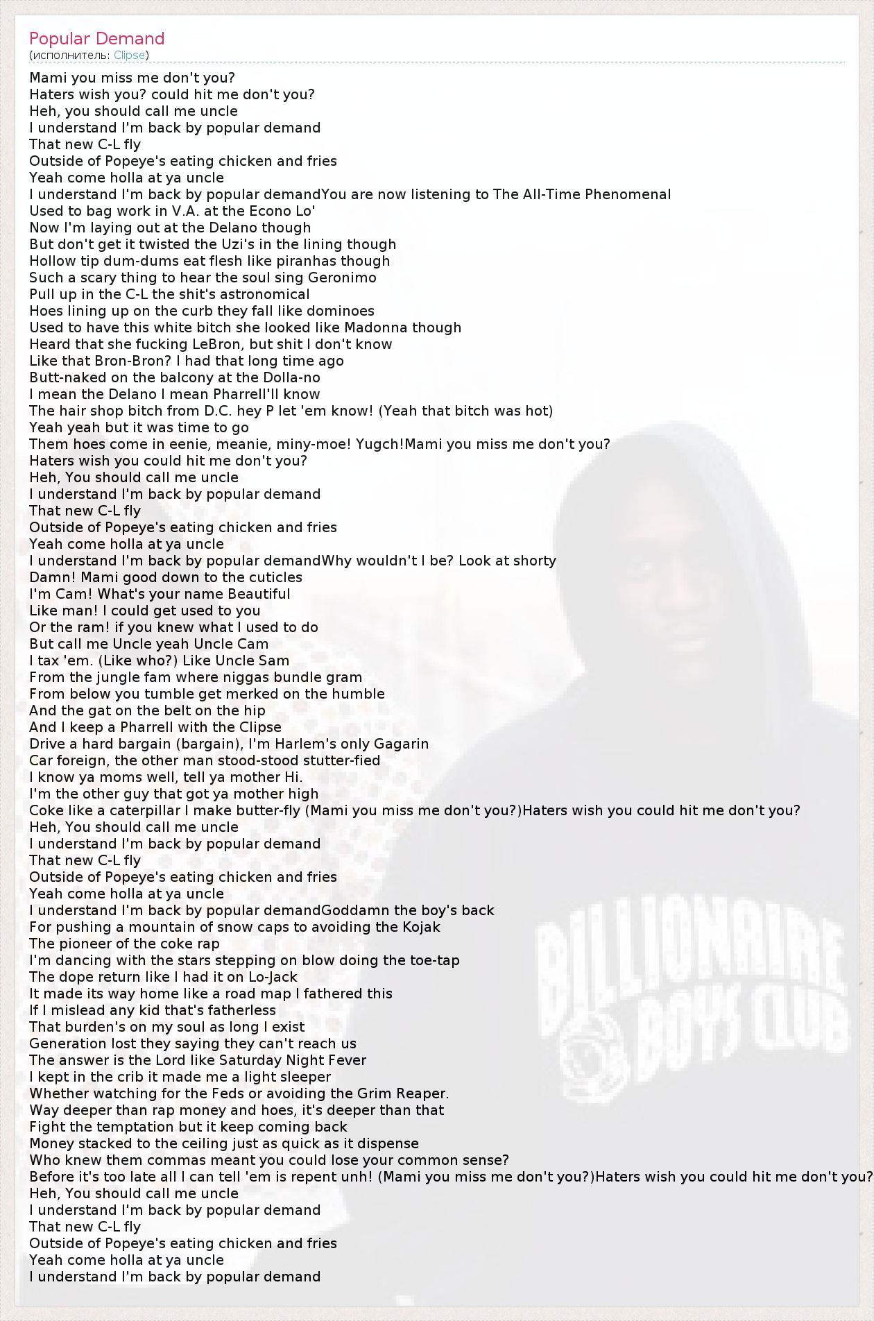 Mami you miss me don't you? Haters wish you? could hit me don't you? Heh, you should call me uncle I understand I'm back by popular demand That new C-L fly Outside of Popeye's eating chicken and fries Yeah come holla at ya uncle I understand I'm back by popular demandYou are now listening to The All-Time Phenomenal Used to bag work in V.A. at the Econo Lo' Now I'm laying out at the Delano though But don't get it twisted the Uzi's in the lining though Hollow tip dum-dums eat flesh like piranhas though Such a scary thing to hear the soul sing Geronimo Pull up in the C-L the shit's astronomical Hoes lining up on the curb they fall like dominoes Used to have this white bitch she looked like Madonna though Heard that she fucking LeBron, but shit I don't know Like that Bron-Bron? I had that long time ago Butt-naked on the balcony at the Dolla-no I mean the Delano I mean Pharrell'll know The hair shop bitch from D.C. hey P let 'em know! (Yeah that bitch was hot) Yeah yeah but it was time to go Them hoes come in eenie, meanie, miny-moe! Yugch!Mami you miss me don't you? Haters wish you could hit me don't you? Heh, You should call me uncle I understand I'm back by popular demand That new C-L fly Outside of Popeye's eating chicken and fries Yeah come holla at ya uncle I understand I'm back by popular demandWhy wouldn't I be? Look at shorty Damn! Mami good down to the cuticles I'm Cam! What's your name Beautiful Like man! I could get used to you Or the ram! if you knew what I used to do But call me Uncle yeah Uncle Cam I tax 'em. (Like who?) Like Uncle Sam From the jungle fam where niggas bundle gram From below you tumble get merked on the humble And the gat on the belt on the hip And I keep a Pharrell with the Clipse Drive a hard bargain (bargain), I'm Harlem's only Gagarin Car foreign, the other man stood-stood stutter-fied I know ya moms well, tell ya mother Hi. I'm the other guy that got ya mother high Coke like a caterpillar I make butter-fly (Mami you miss me don't you?)Haters wish you could hit me don't you? Heh, You should call me uncle I understand I'm back by popular demand That new C-L fly Outside of Popeye's eating chicken and fries Yeah come holla at ya uncle I understand I'm back by popular demandGoddamn the boy's back For pushing a mountain of snow caps to avoiding the Kojak The pioneer of the coke rap I'm dancing with the stars stepping on blow doing the toe-tap The dope return like I had it on Lo-Jack It made its way home like a road map I fathered this If I mislead any kid that's fatherless That burden's on my soul as long I exist Generation lost they saying they can't reach us The answer is the Lord like Saturday Night Fever I kept in the crib it made me a light sleeper Whether watching for the Feds or avoiding the Grim Reaper. Way deeper than rap money and hoes, it's deeper than that Fight the temptation but it keep coming back Money stacked to the ceiling just as quick as it dispense Who knew them commas meant you could lose your common sense? Before it's too late all I can tell 'em is repent unh! (Mami you miss me don't you?)Haters wish you could hit me don't you? Heh, You should call me uncle I understand I'm back by popular demand That new C-L fly Outside of Popeye's eating chicken and fries Yeah come holla at ya uncle I understand I'm back by popular demand