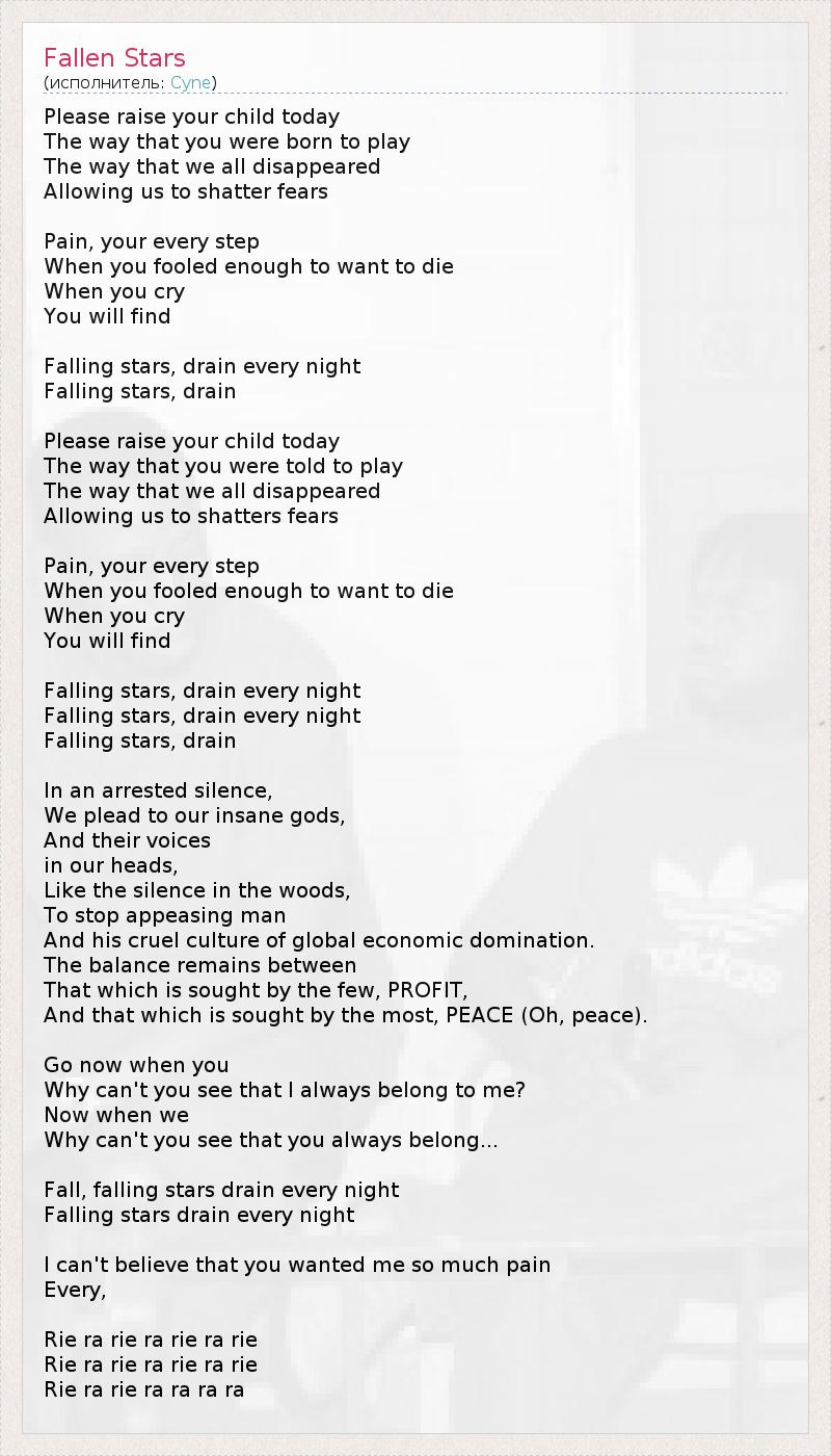 Please raise your child today The way that you were born to play The way that we all disappeared Allowing us to shatter fears Pain, your every step When you fooled enough to want to die When you cry You will find Falling stars, drain every night Falling stars, drain Please raise your child today The way that you were told to play The way that we all disappeared Allowing us to shatters fears Pain, your every step When you fooled enough to want to die When you cry You will find Falling stars, drain every night Falling stars, drain every night Falling stars, drain In an arrested silence, We plead to our insane gods, And their voices in our heads, Like the silence in the woods, To stop appeasing man And his cruel culture of global economic domination. The balance remains between That which is sought by the few, PROFIT, And that which is sought by the most, PEACE (Oh, peace). Go now when you Why can't you see that I always belong to me? Now when we Why can't you see that you always belong... Fall, falling stars drain every night Falling stars drain every night I can't believe that you wanted me so much pain Every, Rie ra rie ra rie ra rie Rie ra rie ra rie ra rie Rie ra rie ra ra ra ra
