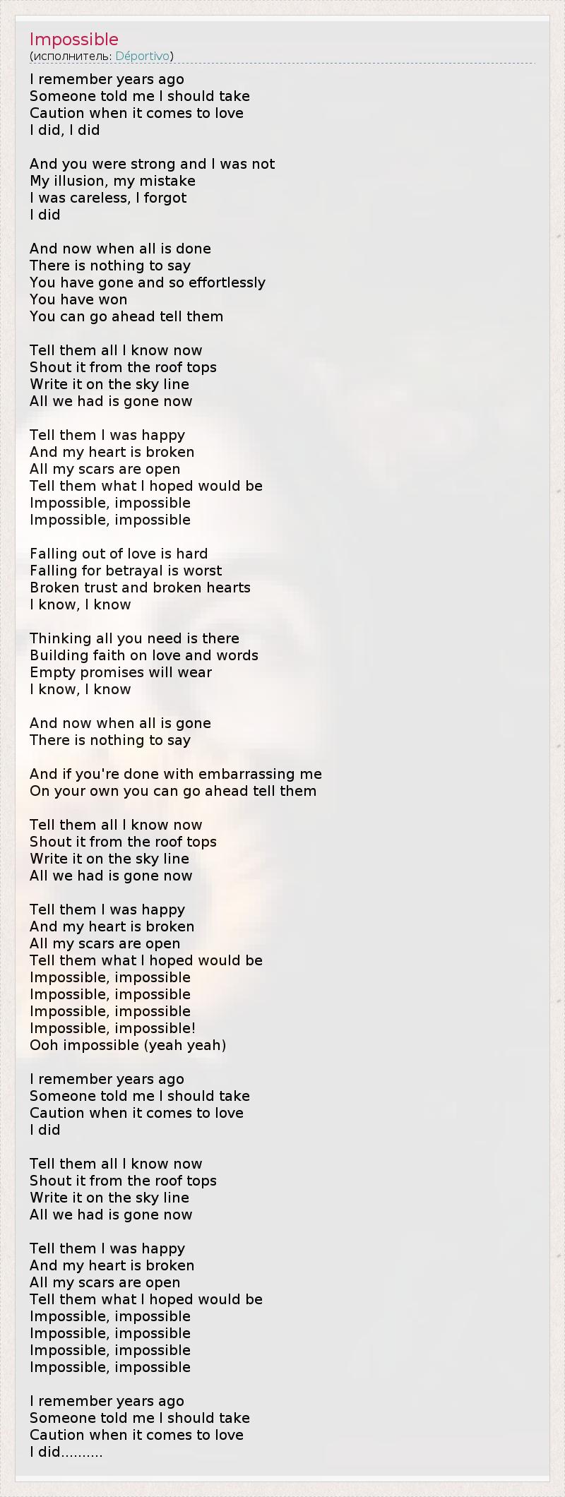 I remember years ago Someone told me I should take Caution when it comes to love I did, I did And you were strong and I was not My illusion, my mistake I was careless, I forgot I did And now when all is done There is nothing to say You have gone and so effortlessly You have won You can go ahead tell them Tell them all I know now Shout it from the roof tops Write it on the sky line All we had is gone now Tell them I was happy And my heart is broken All my scars are open Tell them what I hoped would be Impossible, impossible Impossible, impossible Falling out of love is hard Falling for betrayal is worst Broken trust and broken hearts I know, I know Thinking all you need is there Building faith on love and words Empty promises will wear I know, I know And now when all is gone There is nothing to say And if you're done with embarrassing me On your own you can go ahead tell them Tell them all I know now Shout it from the roof tops Write it on the sky line All we had is gone now Tell them I was happy And my heart is broken All my scars are open Tell them what I hoped would be Impossible, impossible Impossible, impossible Impossible, impossible Impossible, impossible! Ooh impossible (yeah yeah) I remember years ago Someone told me I should take Caution when it comes to love I did Tell them all I know now Shout it from the roof tops Write it on the sky line All we had is gone now Tell them I was happy And my heart is broken All my scars are open Tell them what I hoped would be Impossible, impossible Impossible, impossible Impossible, impossible Impossible, impossible I remember years ago Someone told me I should take Caution when it comes to love I did..........