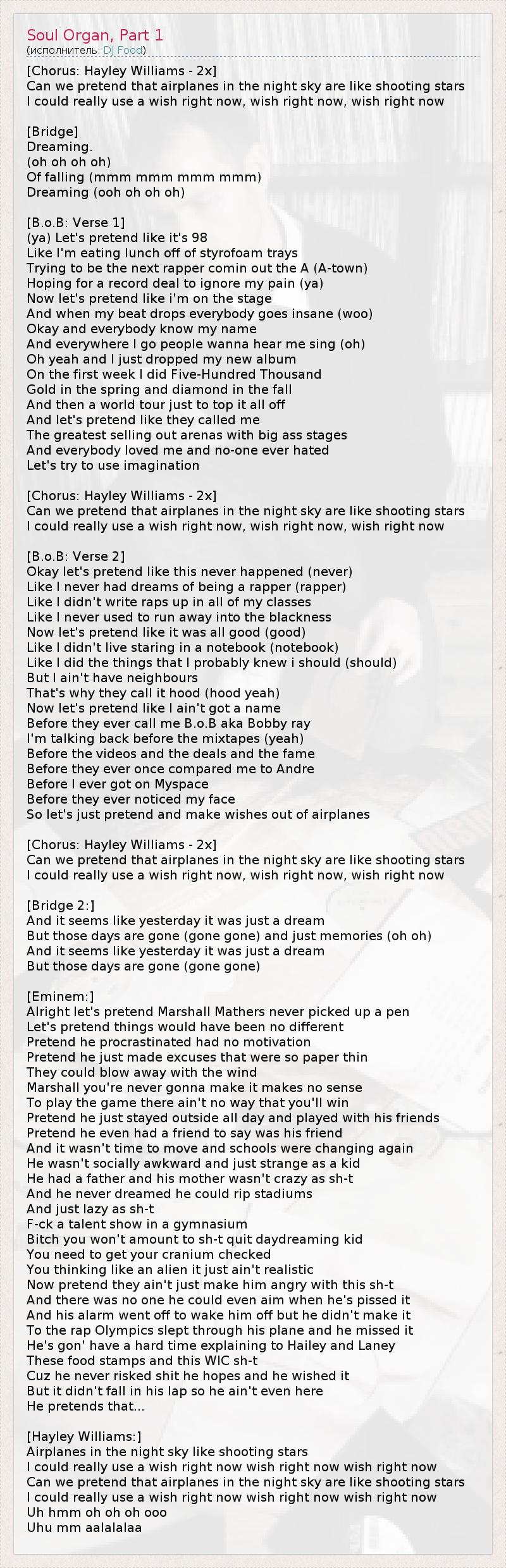 [Припев: 2 раза - Hayley] Мы можем притвориться, что самолёты в ночном небе - это падающие звёзды? Тогда прямо сейчас я могла бы использовать своё желание, своё желание, своё желание... [Переход:] Мечтаю (о, о, о) О том, чтобы упасть (ммм, ммм...) Мечтаю (у, о, о) [B.o.B: 1-ый куплет] Да, давайте притворимся, что мы в 98-ом, Я ем ланч с подноса из пенопласта, Лелея мечту стать ещё одним рэпером из Атланты (Города А), Надеясь без проблем заключить контракт с муз.студией. А теперь сделаем вид, что я на сцене, И при звуке моих битов все начинают сходить с ума (ууу), Окей, и все меня знают, Куда бы я ни пошёл, все хотят слышать, как я пою. О да, я только что выпустил свой новый альбом И в первую неделю продал 500 тыс. копий. К весне - мой альбом золотой, к осени - бриллиантовый, А в довершение всего - мировое турне. Давайте притворимся, что билеты на мои выступления В самых больших концертных залах раскупаются на раз-два-три, Все меня любят, у меня нет врагов, Давайте попробуем включить воображение! [Припев: 2 раза - Hayley] Мы можем притвориться, что самолёты в ночном небе - это падающие звёзды? Тогда прямо сейчас я могла бы использовать своё желание, своё желание, своё желание... [B.o.B: 2-ой куплет] Хорошо, давайте сделаем вид, что этого никогда не было (никогда) Что мне никогда не снились сны о том, что я рэпер (рэпер) Что я не сочинял рэп на уроках в школе, Что я никогда не погружался в уныние. Теперь давайте притворимся, что всё было хорошо (хорошо) Что я не жил, пялясь в ноутбук (ноутбук) И занимался тем, что считал нужным делать (нужным). Но у меня нет соседей, Поэтому место, где я живу, зовётся "гетто" (гетто, да) Притворимся, что у меня нет имени - Что меня не зовут B.o.B, он же Bobby Ray. Я говорю о временах до моих миксов (да), До клипов, до всех контрактов и славы, До того, как меня впервые сравнили с Андрэ, До того, как я открыл страницу на Myspace, До того, как меня приметили. Так давай просто притворимся и загадаем желания на самолёты! [Припев: 2 раза - Hayley] Мы можем притвориться, что самолёты в ночном небе - это падающие звёзды? Тогда прямо сейчас я могла бы использовать своё желание, своё желание, своё желание... [Переход 2:] Кажется, что прошлое - всего лишь сон. Но те дни позади (позади) и остались только воспоминания (о, о) Кажется, что прошлое - всего лишь сон, Но те дни позади (позади) [Eminem:] Хорошо, притворимся, что Маршалл Мэзэрс никогда не брал в руки ручку, Давайте сделаем вид, что тогда ничего бы не изменилось. Притворимся, что он всё откладывал на потом, жил без мотивации, Что он лишь неумело оправдывался, Поэтому его объяснения можно было легко опровергнуть. Маршалл, ты никогда не добьёшься своего, бессмысленно Играть в эту игру, ты ни за что не выиграешь. Притворимся, что он шлялся целыми днями и резвился с друзьями, Что у него был друг, который не отрицал, что он его друг. Он никуда не переезжал, но постоянно менял школы, Он был не трудным в общении, просто странным ребёнком. У него был отец, и мать не была напрочь свихнувшейся. Он не мечтал о том, что сможет порвать целые стадионы, И был страшным ленивцем. "Плюнь ты на шоу талантов в спортзале! Су*а, ты ни х*ра не добьёшься, хватит грезить наяву, пацан! Лучше иди обследуй голову! 1 Ты рассуждаешь как пришелец, это просто невозможно в реале!" Притворимся, что он не злится, когда всякие тупицы несут подобное дер*мо, И что он никому не хочет начистить морду в припадке бешенства. Буд