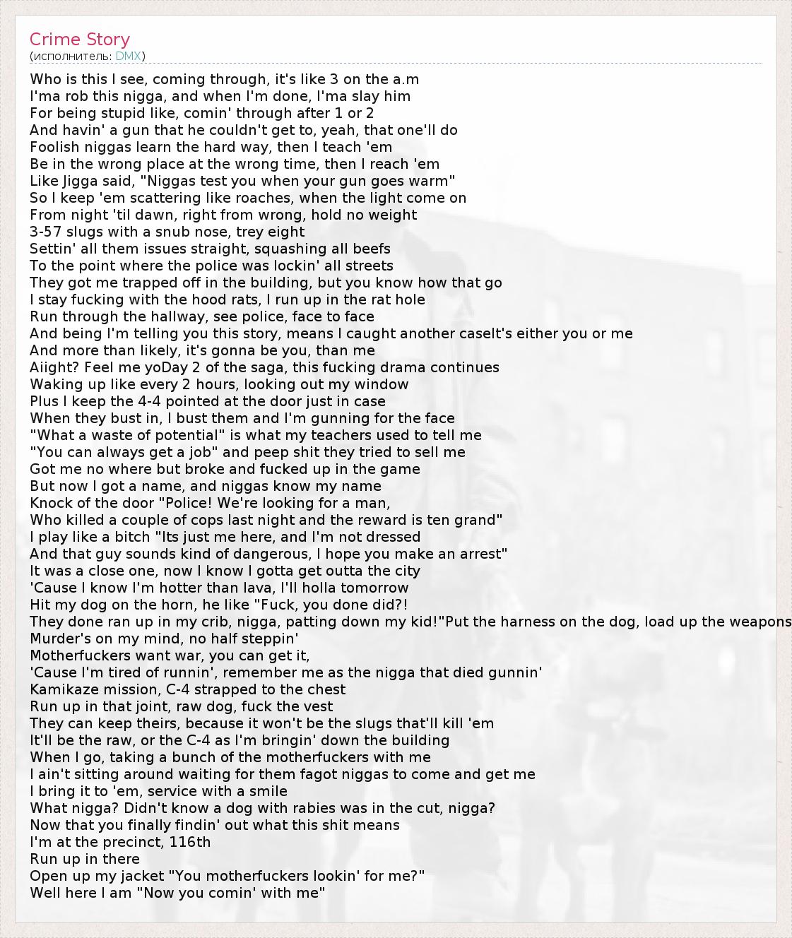 Who is this I see, coming through, it's like 3 on the a.m I'ma rob this nigga, and when I'm done, I'ma slay him For being stupid like, comin' through after 1 or 2 And havin' a gun that he couldn't get to, yeah, that one'll do Foolish niggas learn the hard way, then I teach 'em Be in the wrong place at the wrong time, then I reach 'em Like Jigga said, "Niggas test you when your gun goes warm" So I keep 'em scattering like roaches, when the light come on From night 'til dawn, right from wrong, hold no weight 3-57 slugs with a snub nose, trey eight Settin' all them issues straight, squashing all beefs To the point where the police was lockin' all streets They got me trapped off in the building, but you know how that go I stay fucking with the hood rats, I run up in the rat hole Run through the hallway, see police, face to face And being I'm telling you this story, means I caught another caseIt's either you or me And more than likely, it's gonna be you, than me Aiight? Feel me yoDay 2 of the saga, this fucking drama continues Waking up like every 2 hours, looking out my window Plus I keep the 4-4 pointed at the door just in case When they bust in, I bust them and I'm gunning for the face "What a waste of potential" is what my teachers used to tell me "You can always get a job" and peep shit they tried to sell me Got me no where but broke and fucked up in the game But now I got a name, and niggas know my name Knock of the door "Police! We're looking for a man, Who killed a couple of cops last night and the reward is ten grand" I play like a bitch "Its just me here, and I'm not dressed And that guy sounds kind of dangerous, I hope you make an arrest" It was a close one, now I know I gotta get outta the city 'Cause I know I'm hotter than lava, I'll holla tomorrow Hit my dog on the horn, he like "Fuck, you done did?! They done ran up in my crib, nigga, patting down my kid!"Put the harness on the dog, load up the weapons Murder's on my mind, no half steppin' Motherfuckers want war, you can get it, 'Cause I'm tired of runnin', remember me as the nigga that died gunnin' Kamikaze mission, C-4 strapped to the chest Run up in that joint, raw dog, fuck the vest They can keep theirs, because it won't be the slugs that'll kill 'em It'll be the raw, or the C-4 as I'm bringin' down the building When I go, taking a bunch of the motherfuckers with me I ain't sitting around waiting for them fagot niggas to come and get me I bring it to 'em, service with a smile What nigga? Didn't know a dog with rabies was in the cut, nigga? Now that you finally findin' out what this shit means I'm at the precinct, 116th Run up in there Open up my jacket "You motherfuckers lookin' for me?" Well here I am "Now you comin' with me"
