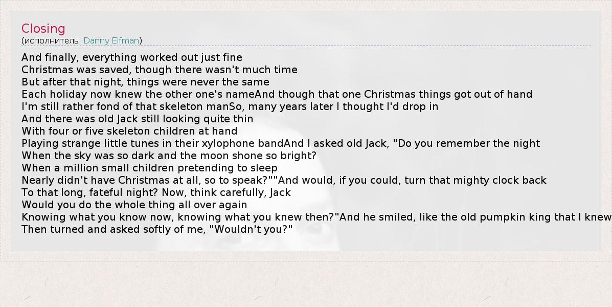 Это интересно:Дэниэл Роберт Эльфман, известный американский композитор, уверенно сочетает инструментальную и часто оркестровую музыку с электронной, что делает эту музыку его "торговой маркой".Один из самых востребованных композиторов современного кинематографа США.Он написал саундтрэки к таким фильмам как "Битлджус", мульфильм "Кошмар перед Рождеством" (а также озвучивал... продолжение
