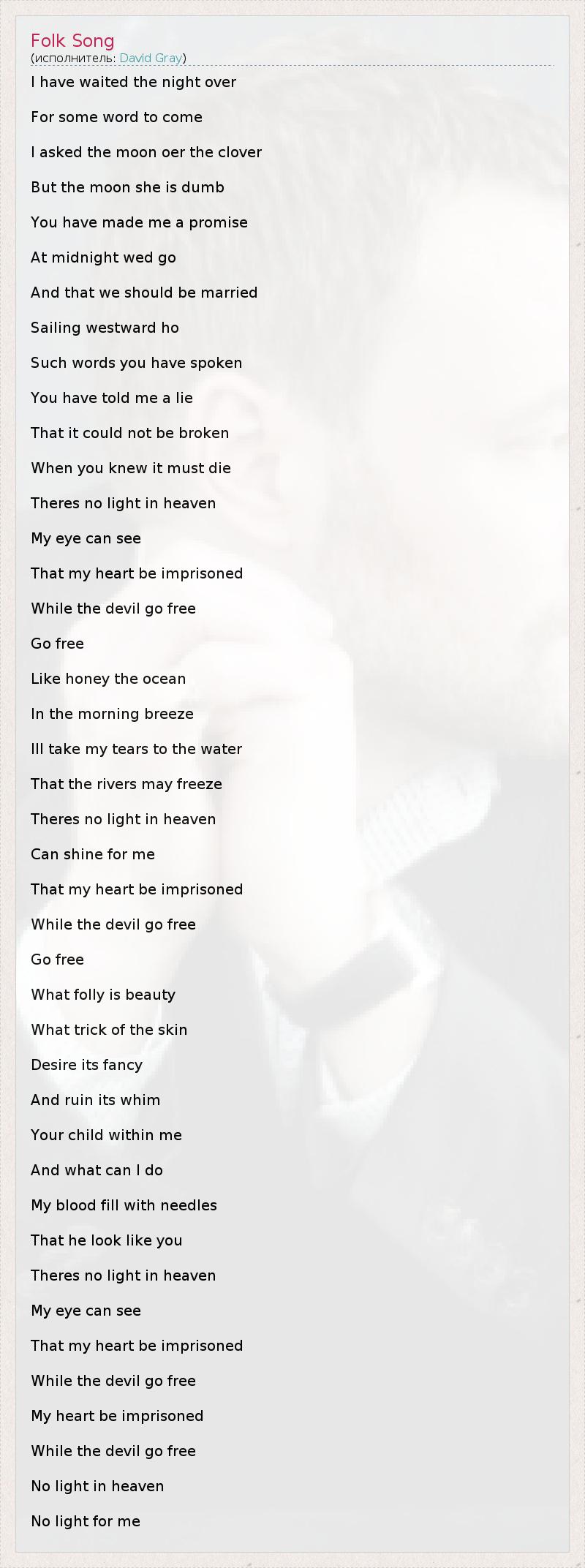 Это интересно:Появившись на свет в Манчестере в 1968 году, Дэвид Грэй еще школьником переехал с родителями в Уэльс, где и закончил школу, поступив позже в университет Ливерпуля. В студенческие годы начал играть в разных панк-командах и сам писать песни, правда в несколько иной стилистике. Позже переезжает в Лондон, где ему удается заключить контракты с британском лэйблом Hut Records и американским Caroline, и... продолжение
