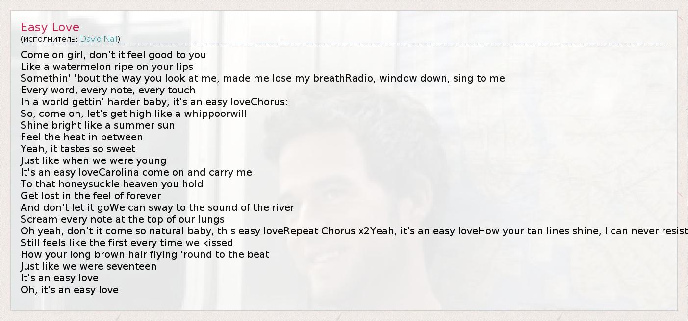 Come on girl, don't it feel good to you Like a watermelon ripe on your lips Somethin' 'bout the way you look at me, made me lose my breathRadio, window down, sing to me Every word, every note, every touch In a world gettin' harder baby, it's an easy loveChorus: So, come on, let's get high like a whippoorwill Shine bright like a summer sun Feel the heat in between Yeah, it tastes so sweet Just like when we were young It's an easy loveCarolina come on and carry me To that honeysuckle heaven you hold Get lost in the feel of forever And don't let it goWe can sway to the sound of the river Scream every note at the top of our lungs Oh yeah, don't it come so natural baby, this easy loveRepeat Chorus x2Yeah, it's an easy loveHow your tan lines shine, I can never resist Still feels like the first every time we kissed How your long brown hair flying 'round to the beat Just like we were seventeen It's an easy love Oh, it's an easy love