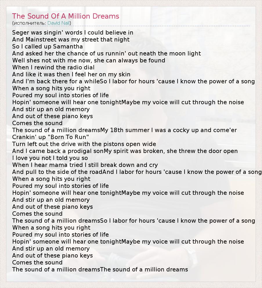 Seger was singin' words I could believe in And Mainstreet was my street that night So I called up Samantha And asked her the chance of us runnin' out neath the moon light Well shes not with me now, she can always be found When I rewind the radio dial And like it was then I feel her on my skin And I'm back there for a whileSo I labor for hours 'cause I know the power of a song When a song hits you right Poured my soul into stories of life Hopin' someone will hear one tonightMaybe my voice will cut through the noise And stir up an old memory And out of these piano keys Comes the sound The sound of a million dreamsMy 18th summer I was a cocky up and come'er Crankin' up "Born To Run" Turn left out the drive with the pistons open wide And I came back a prodigal sonMy spirit was broken, she threw the door open I love you not I told you so When I hear mama tried I still break down and cry And pull to the side of the roadAnd I labor for hours 'cause I know the power of a song When a song hits you right Poured my soul into stories of life Hopin' someone will hear one tonightMaybe my voice will cut through the noise And stir up an old memory And out of these piano keys Comes the sound The sound of a million dreamsSo I labor for hours 'cause I know the power of a song When a song hits you right Poured my soul into stories of life Hopin' someone will hear one tonightMaybe my voice will cut through the noise And stir up an old memory And out of these piano keys Comes the sound The sound of a million dreamsThe sound of a million dreams