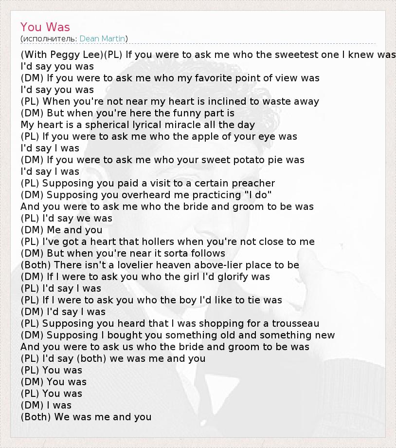 Это интересно:Дино Пол Крочетти (англ. Dino Paul Crocetti), более известный как Дин Ма́ртин (англ. Dean Martin) родился 7 июня 1917 года в Стобенвиле, штат Огайо, США. В молодости профессионально занимался боксом, выступал на матчах, любил карточные игры. В ранние годы планировал в будущем стать певцом, актёром. Долгое время выступал в ночных клубах родного города, исполняя разнообразные песни. Позже начал гастролировать... продолжение