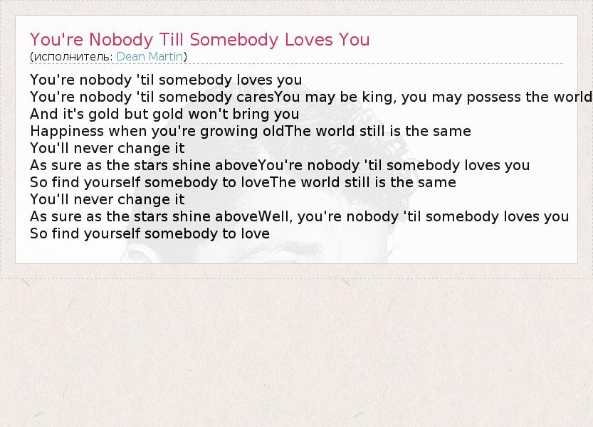 You're nobody 'til somebody loves you You're nobody 'til somebody caresYou may be king, you may possess the world And it's gold but gold won't bring you Happiness when you're growing oldThe world still is the same You'll never change it As sure as the stars shine aboveYou're nobody 'til somebody loves you So find yourself somebody to loveThe world still is the same You'll never change it As sure as the stars shine aboveWell, you're nobody 'til somebody loves you So find yourself somebody to love