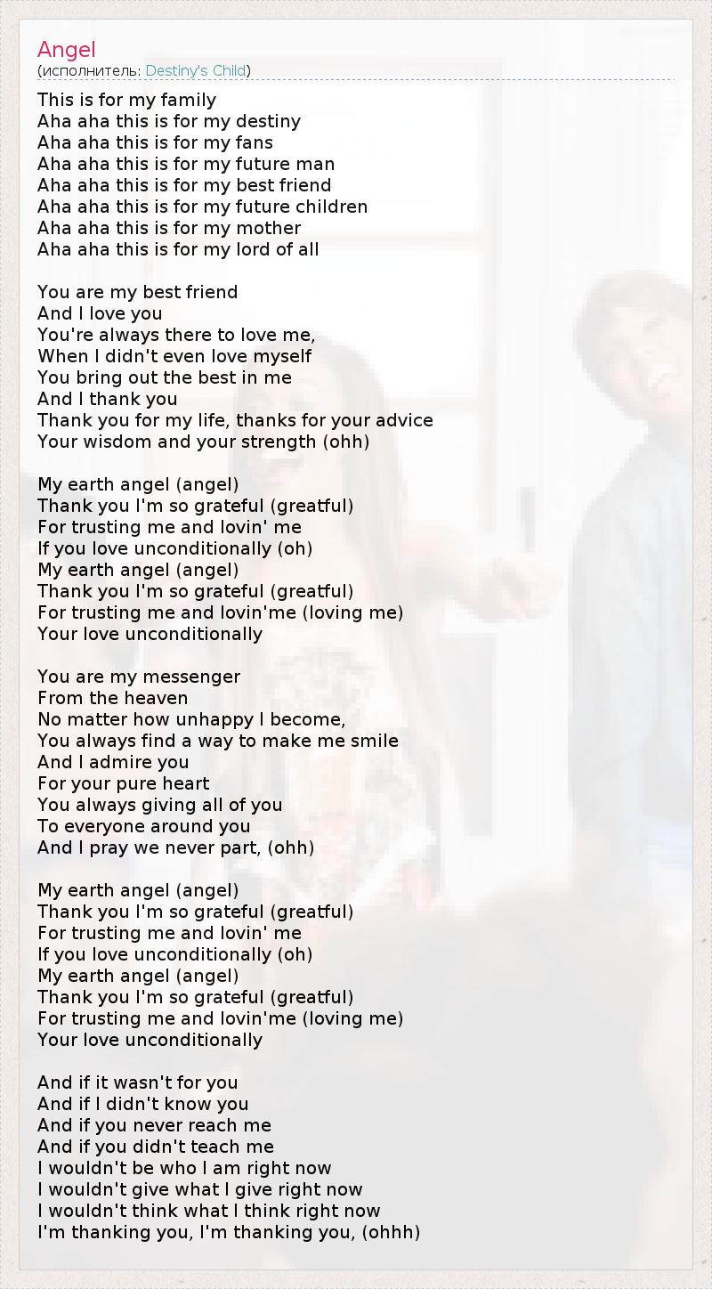 Это для моей семьи, Да, да, это для моей судьбы, Да, да, это для моих поклонников, Да, да, это для моего будущего мужчины, Да, да, это для моего лучшего друга, Да, да, это для моих будущих детей, Да, да, это для моей мамы, Да, да, это для Бога всевышнего.. Ты мой лучший друг И я люблю тебя. Ты всегда рядом, чтобы любить меня, Даже когда я не люблю себя. Ты выявляешь лучшее во мне, И я благодарна тебе, Благодарна за мою жизнь, благодарна за твои советы, За твою мудрость и силу. Мой земной ангел (ангел), Я так благодарна тебе (благодарна) За то, что доверяешь мне и любишь меня. Твоя любовь безусловна, Мой земной ангел (ангел), Я так благодарна тебе (благодарна) За то, что доверяешь мне и любишь меня. Твоя любовь безусловна... Ты мой посланник С небес. Какой бы грустной я ни становилась, Ты всегда вызовешь у меня улыбку. И я восхищаюсь тобой, Твоим чистым сердцем. Ты всегда передаешь всё от себя Всем вокруг. И я молюсь, чтобы мы не расставались... Мой земной ангел (ангел), Я так благодарна тебе (благодарна) За то, что доверяешь мне и любишь меня. Твоя любовь безусловна, Мой земной ангел (ангел), Я так благодарна тебе (благодарна) За то, что доверяешь мне и любишь меня. Твоя любовь безусловна... И если бы не было тебя, И если бы я не знала тебя, Ты бы никогда не потянулся ко мне, И если бы ты не учил меня, Я бы не была той, кто я сейчас, Я бы не могла дать то, что я даю сейчас, Я бы не могла думать о том, о чем я думаю сейчас, Я благодарю тебя, я благодарю тебя...